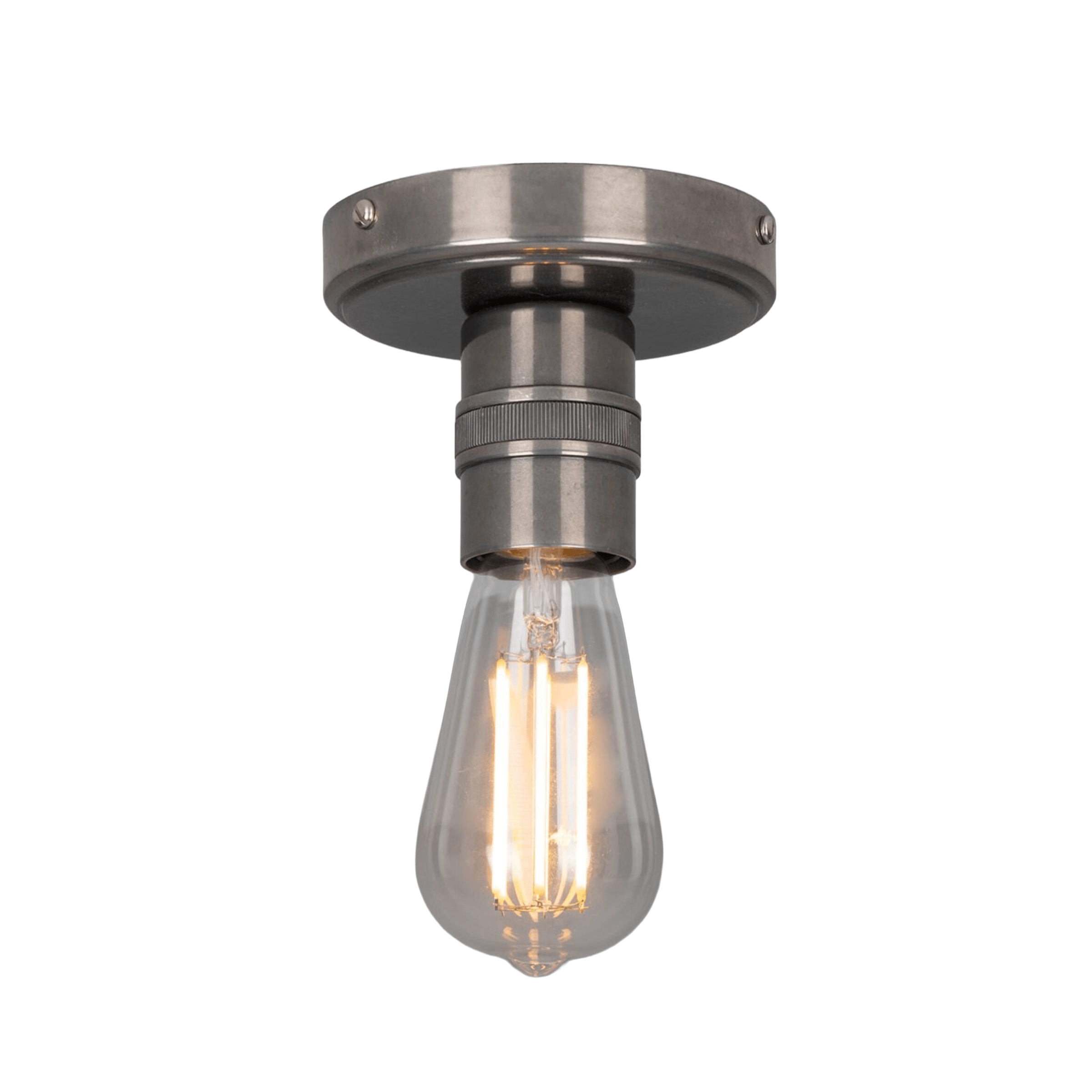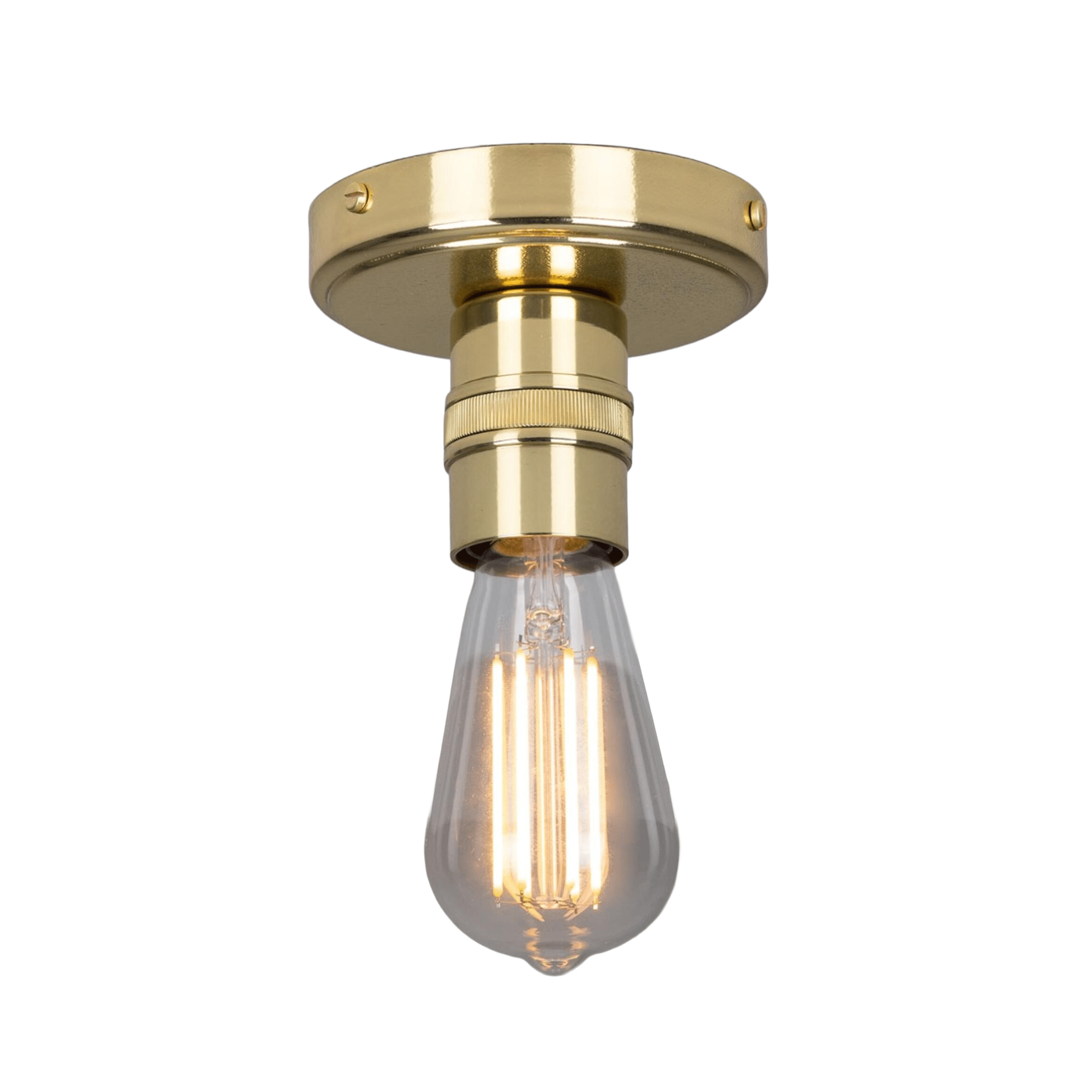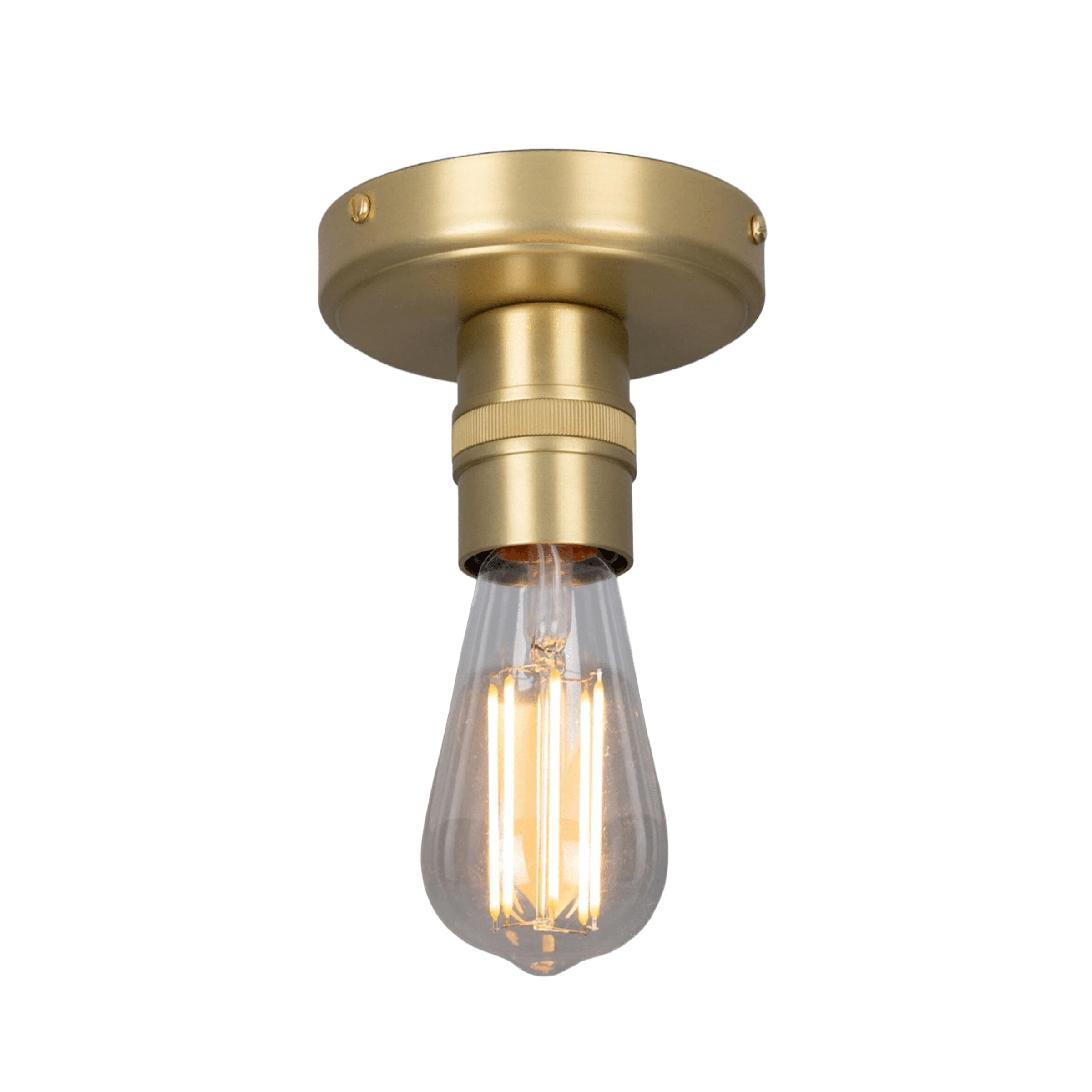 Embracing the minimalist aesthetic, the Devon Flush Ceiling Light features a simple brass ceiling rose and matching lamp holder. With timeless simplicity, the Devon Light adapts seamlessly to both modern and traditional vintage interiors. The Devon Flush Ceiling Light boasts a refined design, characterized by a brass ceiling rose and a three-part brass lampholder. Versatile enough for various settings, it complements hallways, kitchens, and commercial spaces like bars and restaurants. For the IP65 (wet location rated) version of this flush mount, see the Kura Brass and Glass Ceiling Light. Bulb is sold separately.