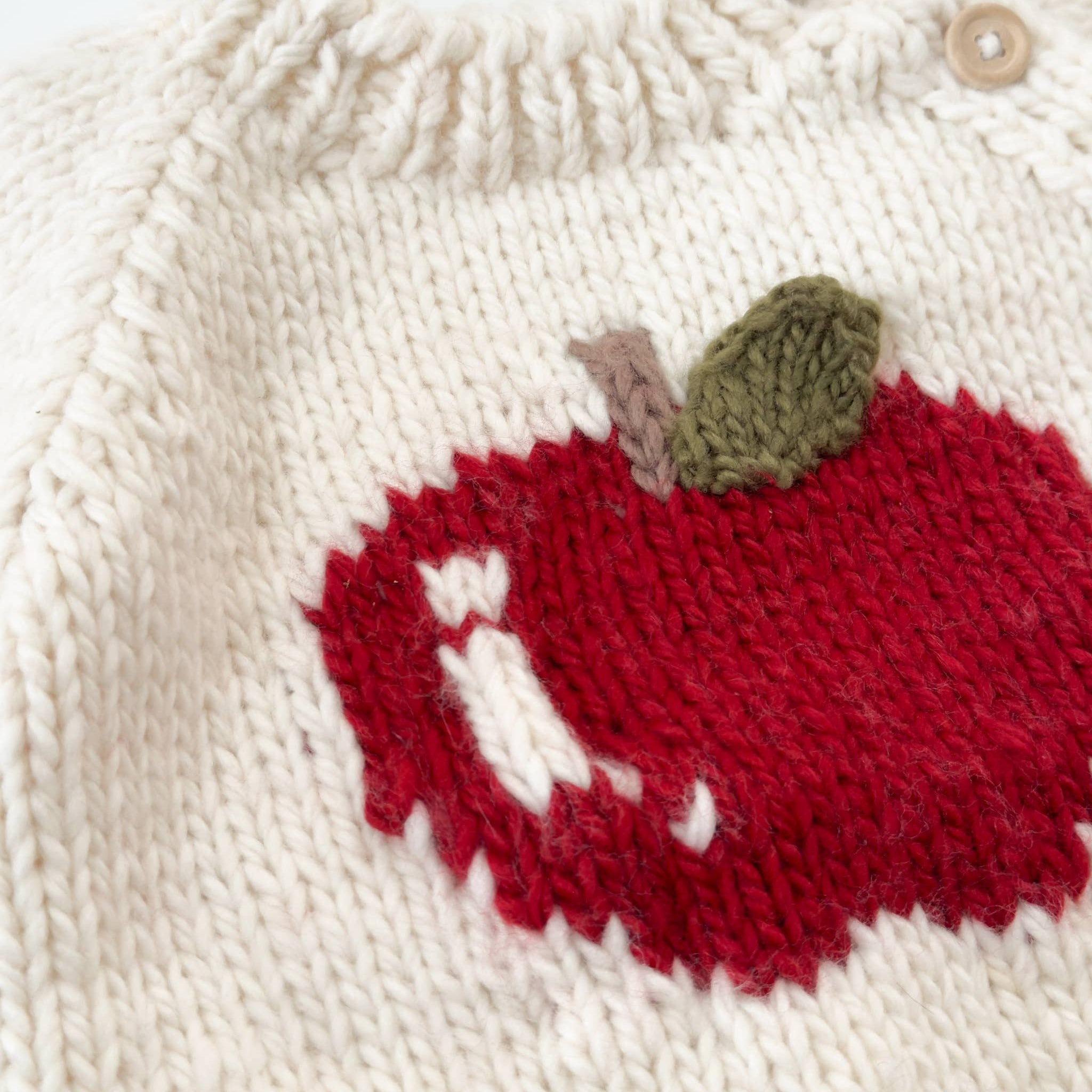 Take a bite into fall with the Apple Pullover Sweater. This cream cardigan features a red apple with a partially attached three-dimensional leaf. Three wooden buttons on the left shoulder can be undone to widen the neck of the pullover, making it easier to put on little ones. Crafted with care using 100% hand-knit acrylic. Hand wash and lay flat to dry.