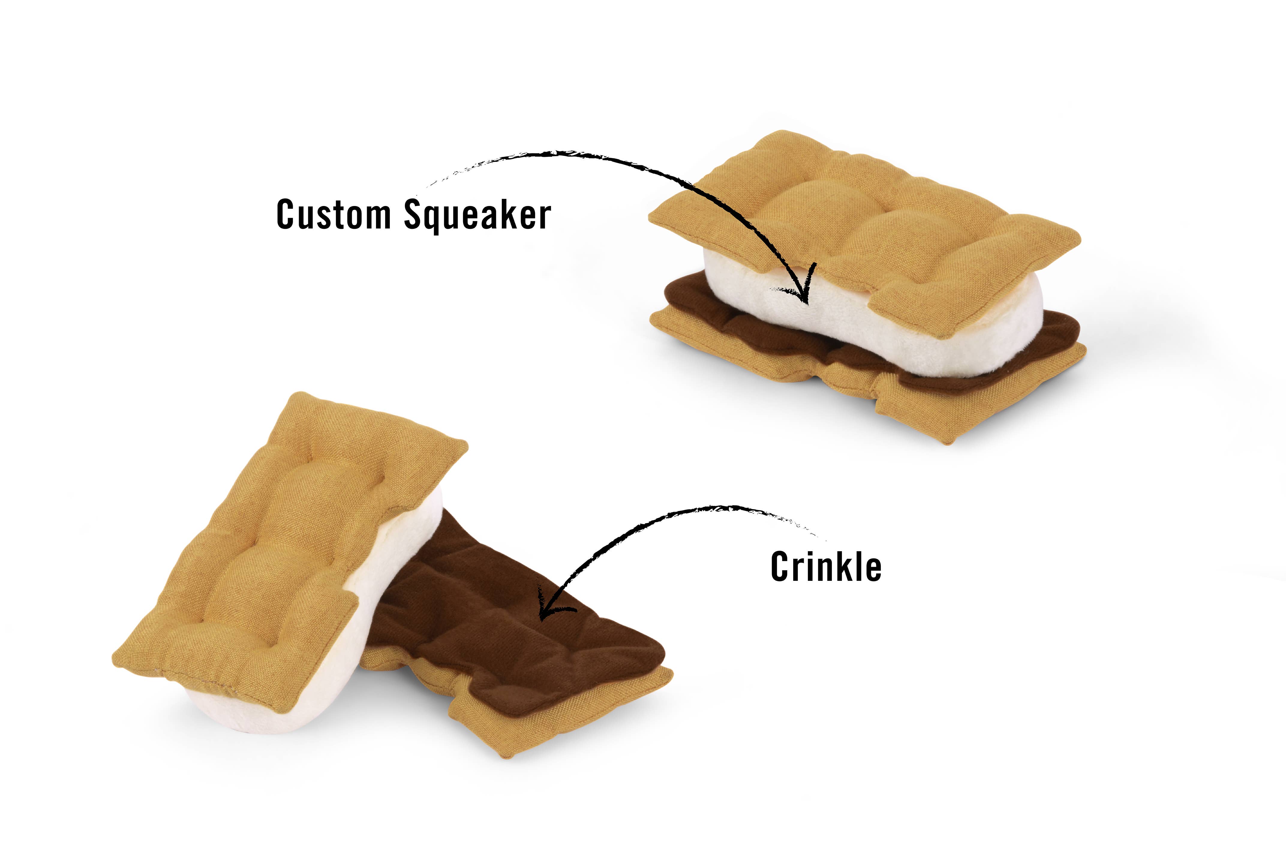 Boasting crinkles and squeakers for irresistible play, this cleverly designed toy also detaches for interactive fun. Hand-made craftsmanship, double layer exterior and reinforced stitching for extra durability.