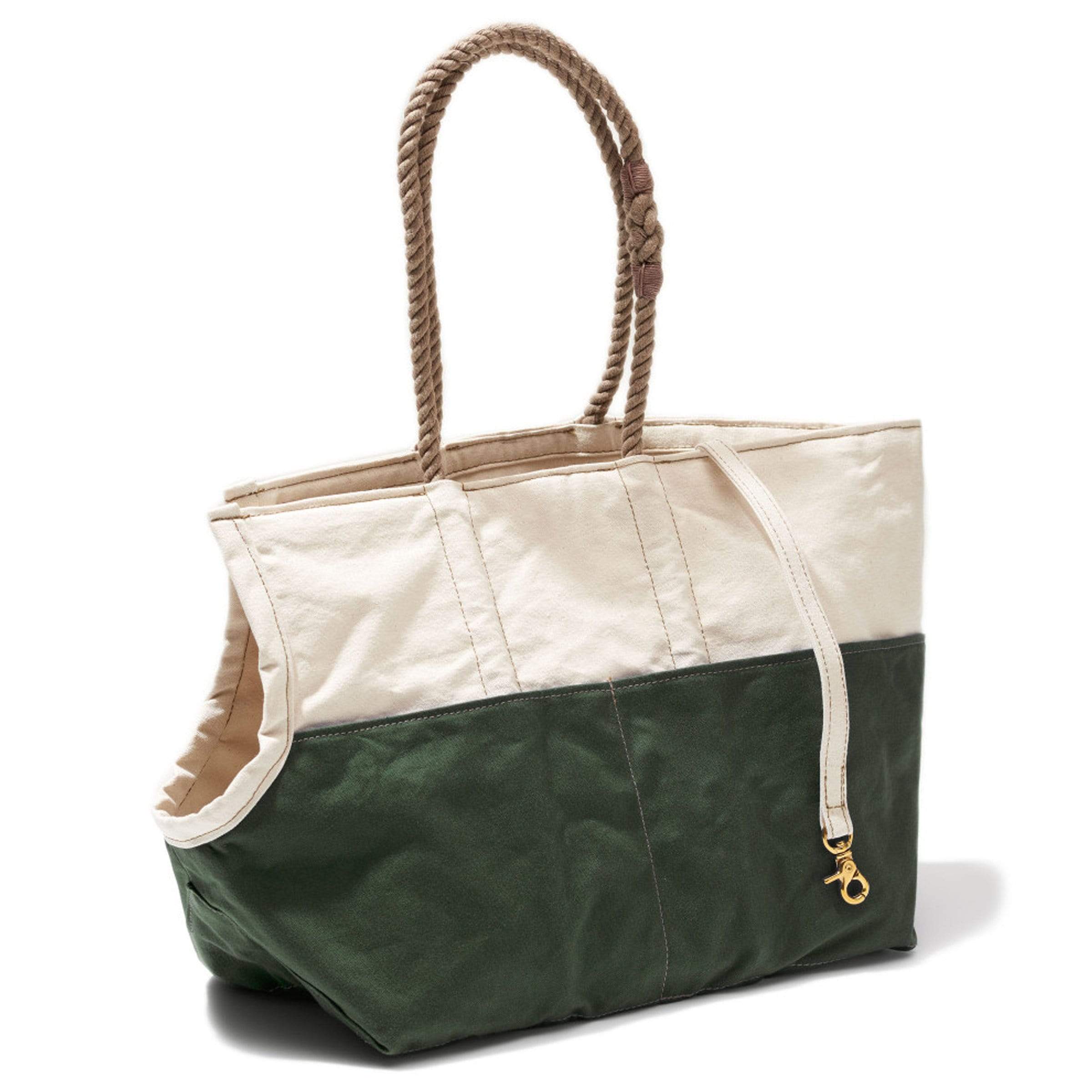 This dog carrier is hand-crafted in New York from domestically sourced waxed cotton canvas and commercial grade canvas. The handles are hand spliced and whipped. Finished with solid brass top quality zipper for closure. Solid brass clip inside for attachment to dog's collar. Inside pocket for wallet and cellphone.