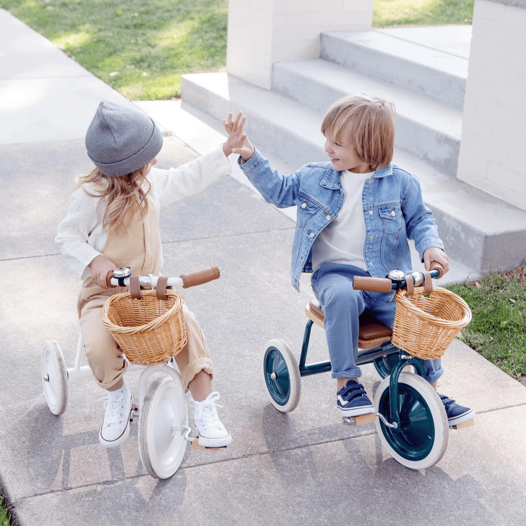 Playful and thoughtfully designed. This classic tricycle features an oak seat, leather-look grips, and a wicker basket in front—perfect for slow rides around the neighborhood