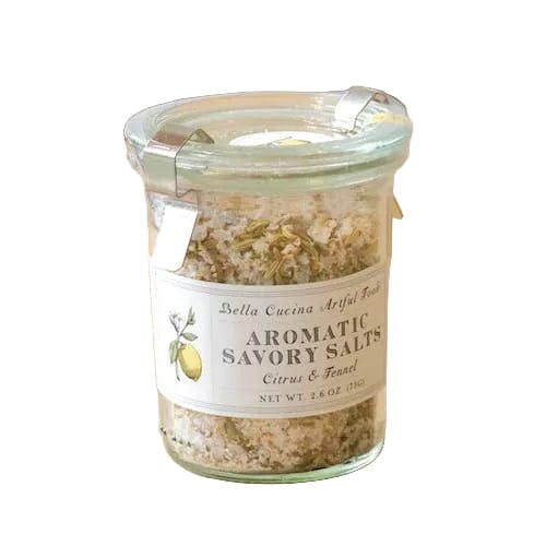 A fresh and light combination of oven-dried citrus peel and fragrant fennel seeds are laced with flat salt crystals imported from Europe. Use the salts on chicken, fish or vegetables to bring a taste of the Mediterranean to your table. Comes in a 2.6 oz in weck jar.
