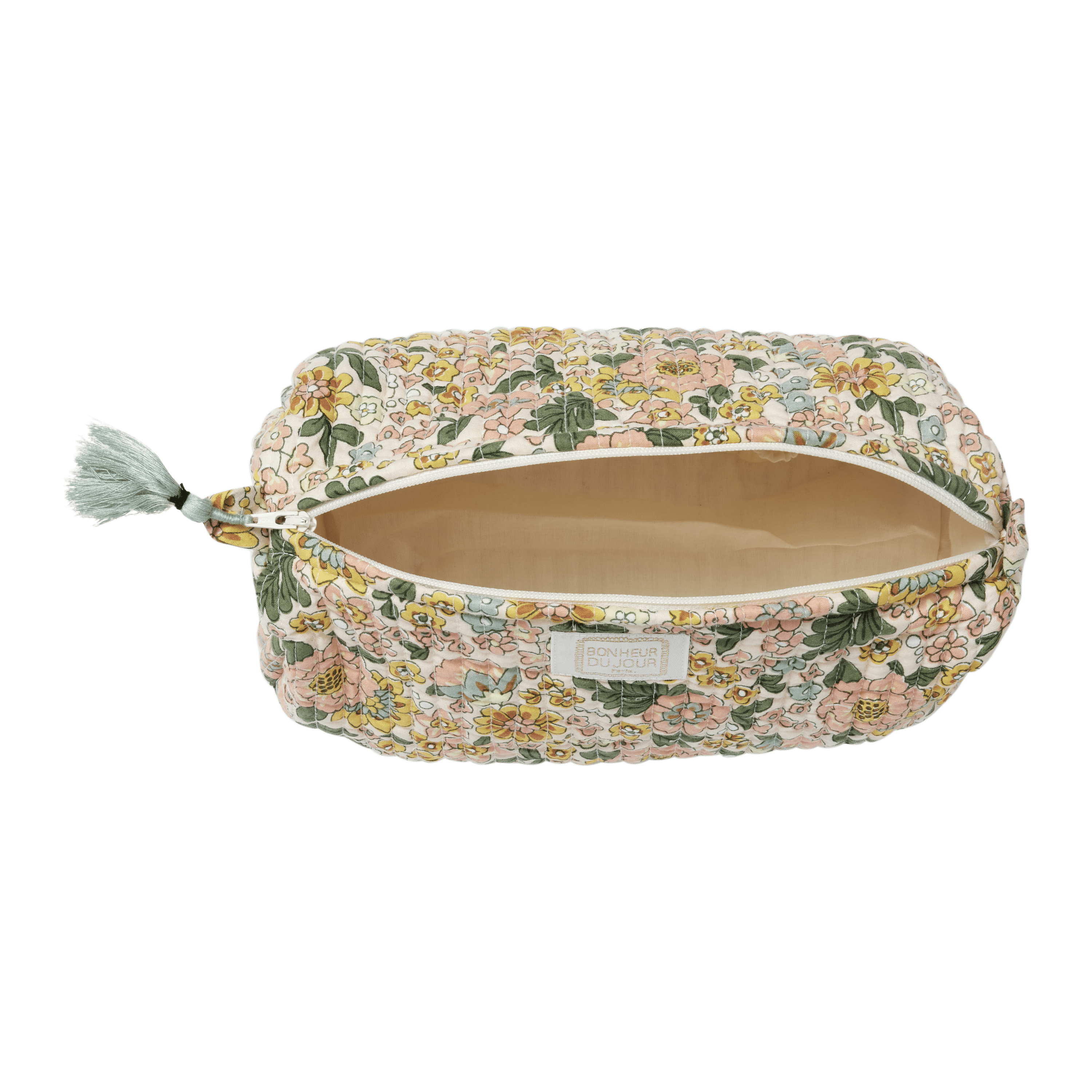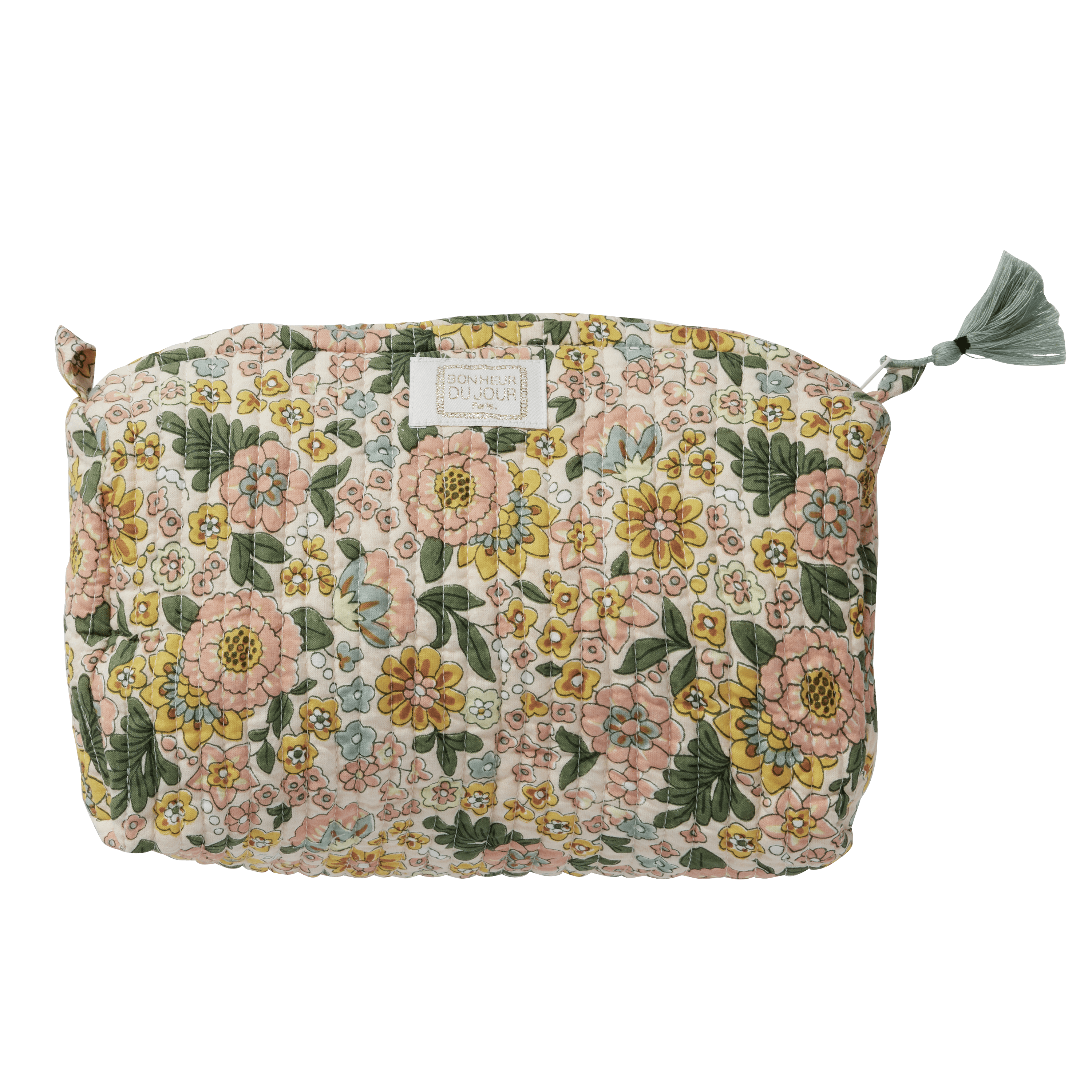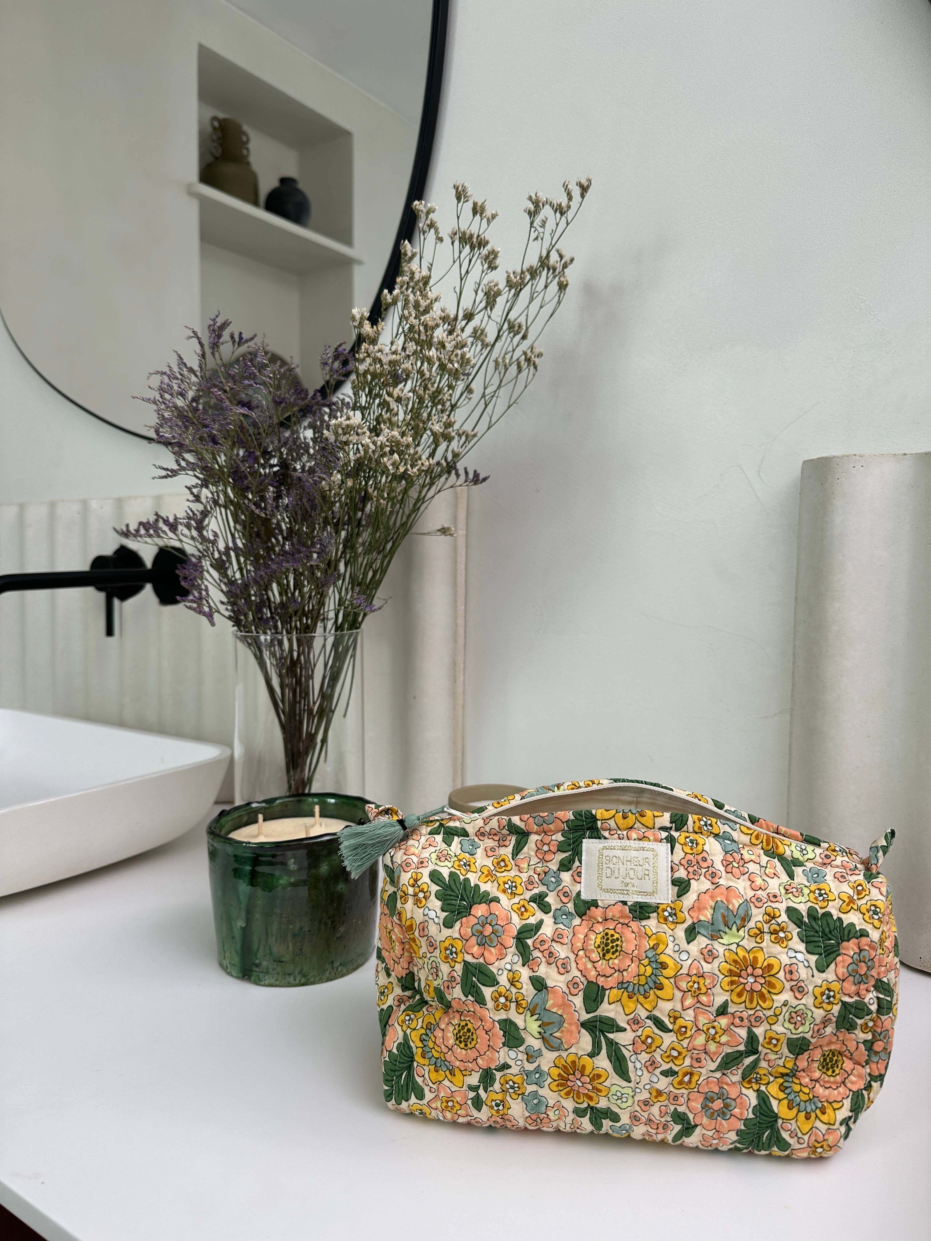 Toiletry bag with printed flowers, zipper opening, and handmade tassels on the edge of the zipper. Vertical stitch quilting, made of soft-touch poplin.