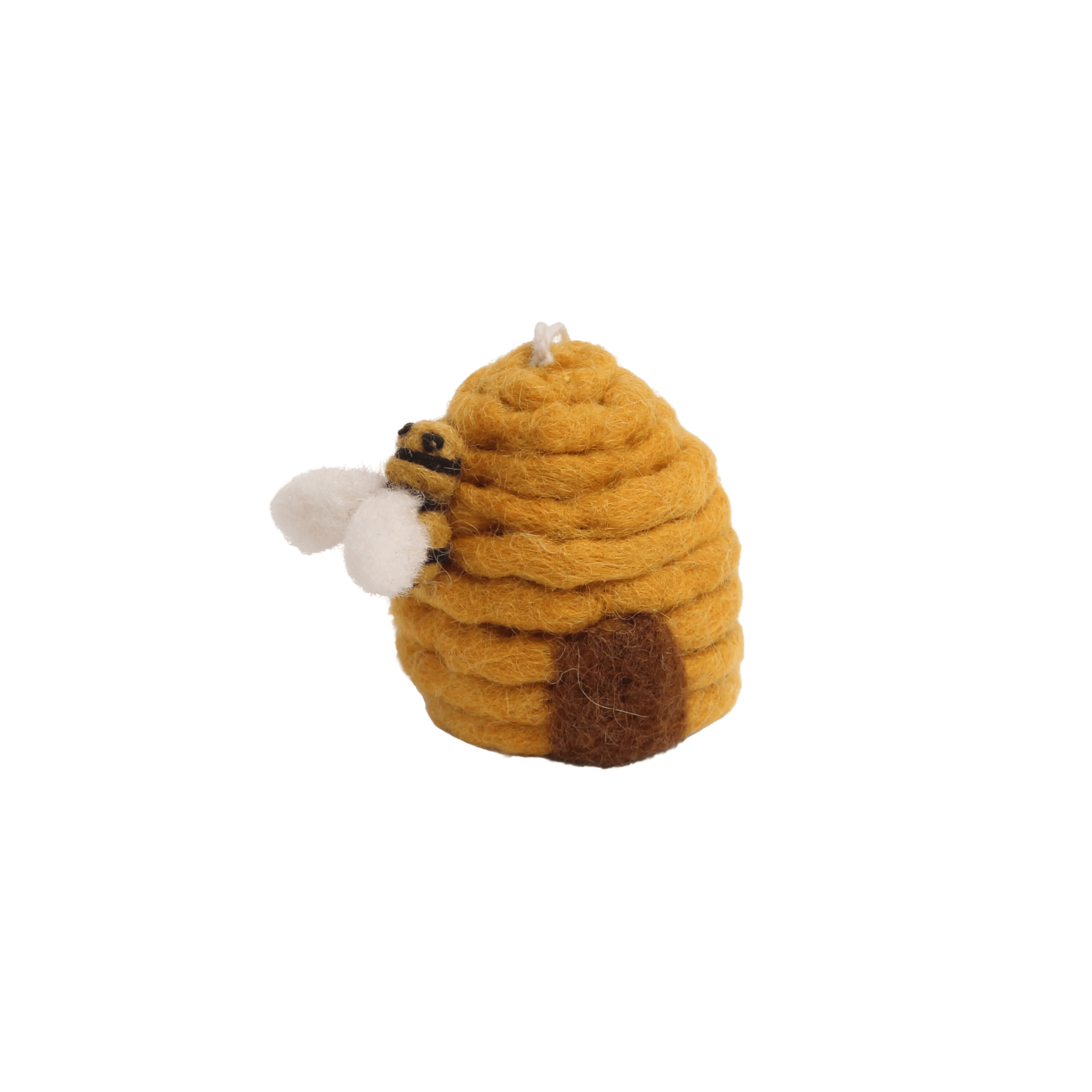 This mini felt beehive ornament features an adorable bee resident arriving home for a whimsical touch. Measuring about 5 x 3 cm, it's a charming addition to your holiday tree or seasonal decor. Handmade in Nepal.