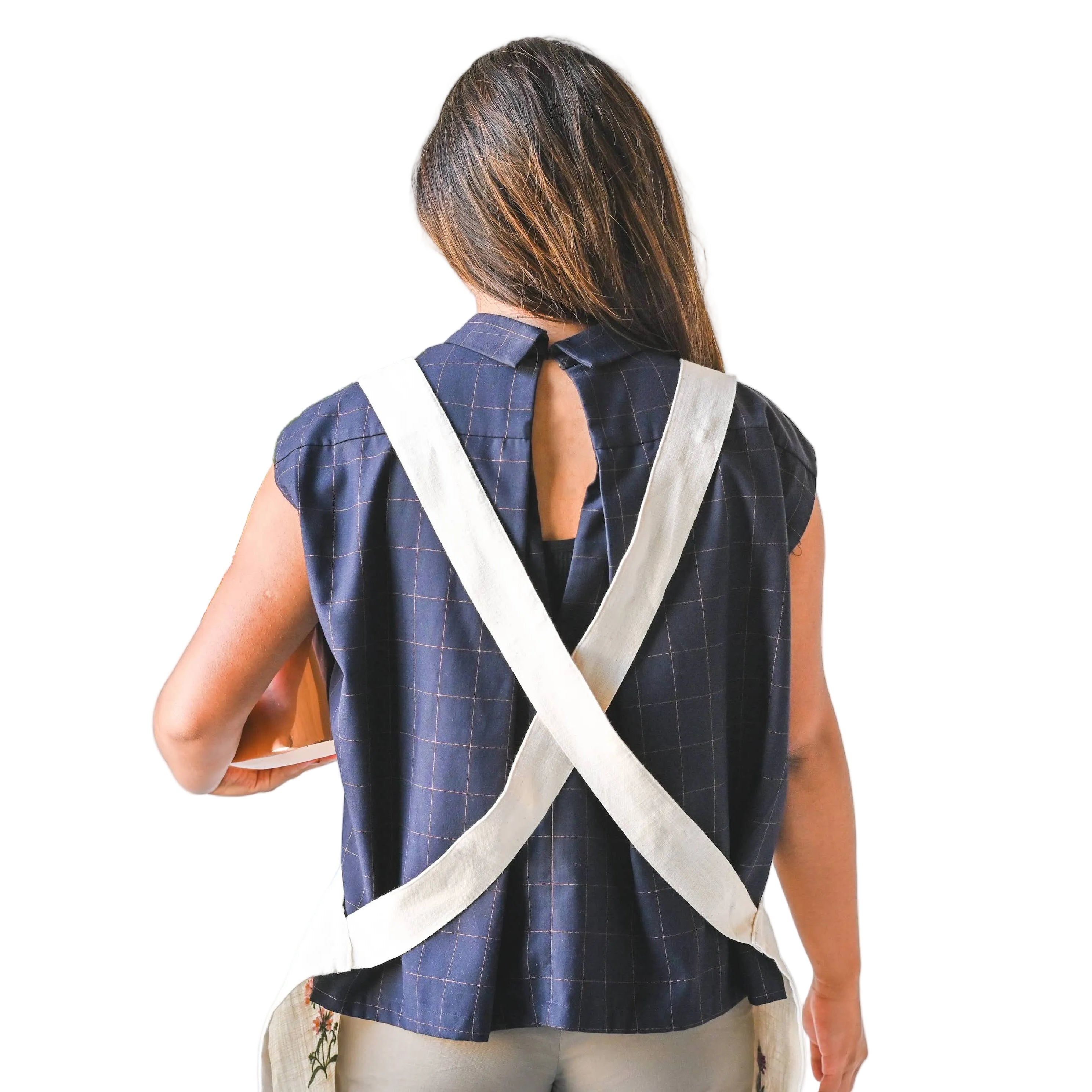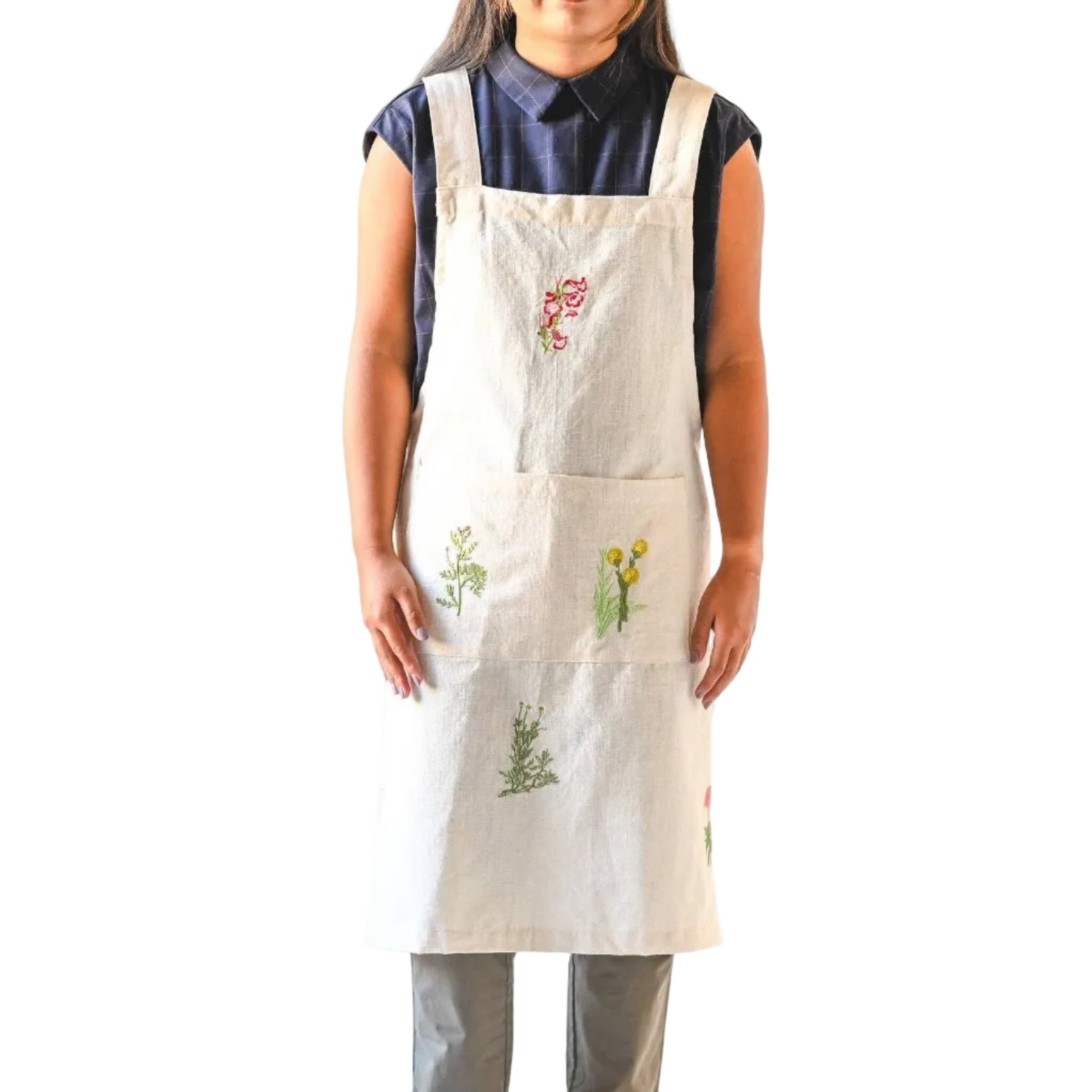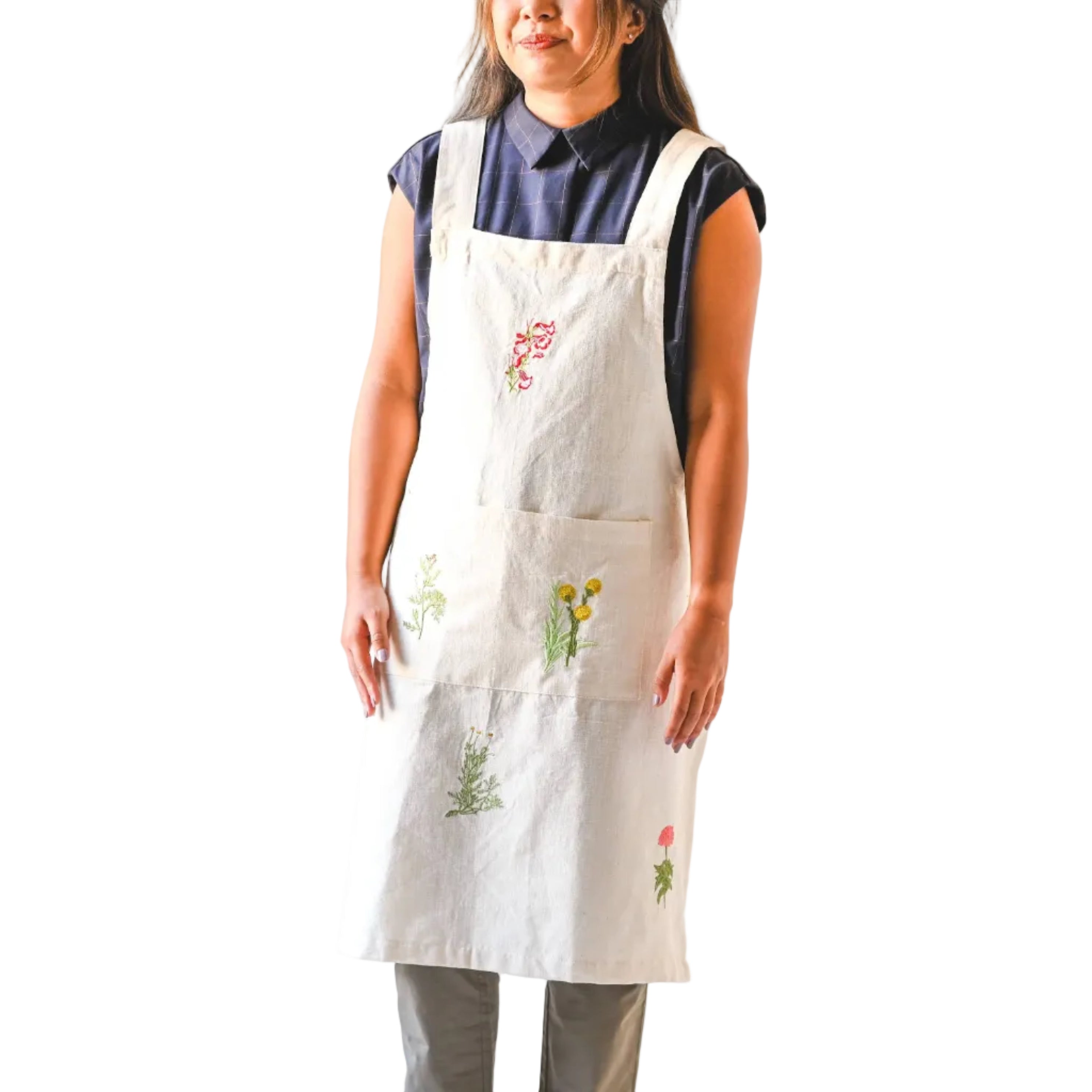 Whether you're baking cookies or picking tomatoes from your vegetable garden, this botanical apron is the perfect blend of functionality and beauty to get the job done! Designed to be simple, featuring two front pockets for storing baking utensils or gardening shears. The back of the apron crisscrosses, making putting on and taking off the apron easy and comfortable. Embroidered botanicals featured on the front. Machine washable.