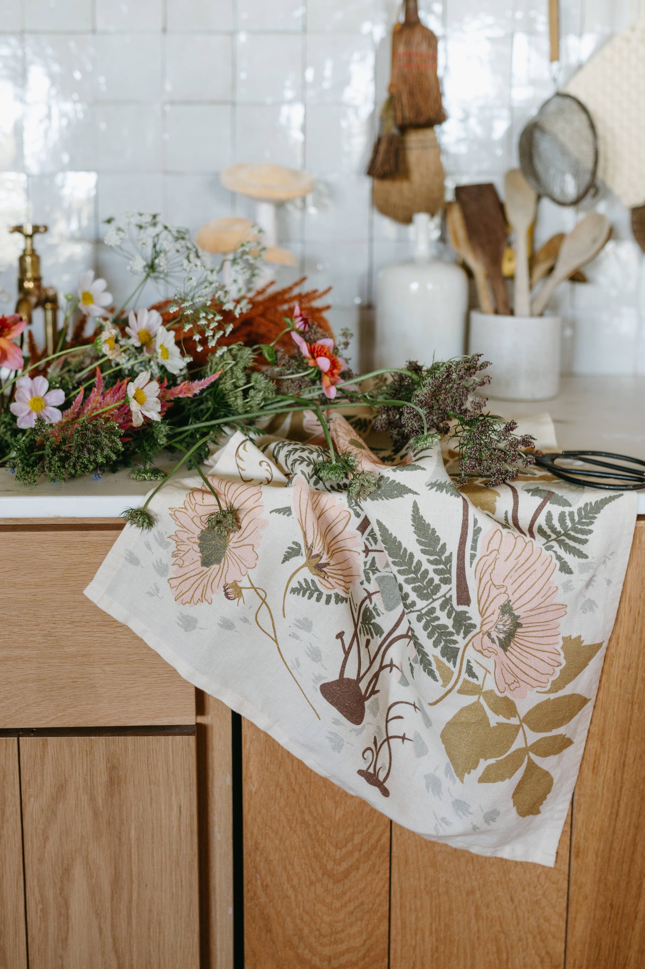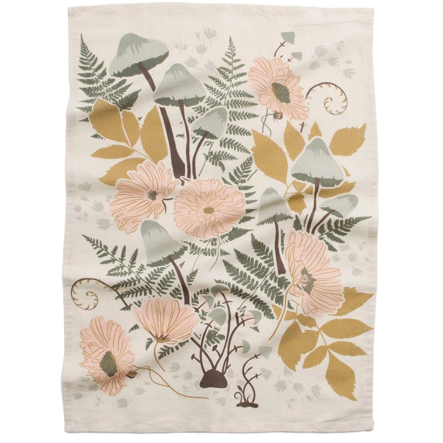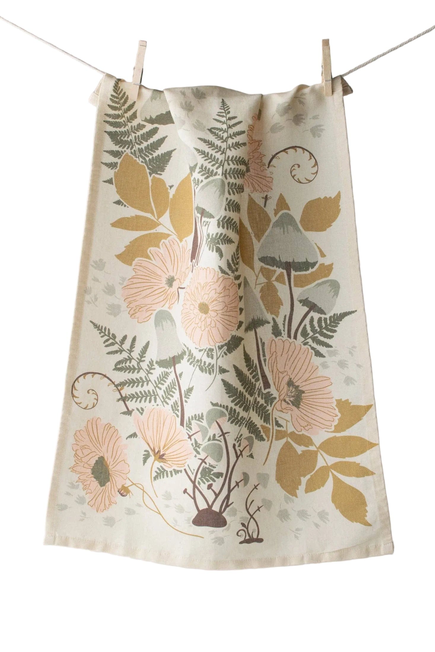 Celebrate simple beauty with the Forest Floor Tea Towel. A whimsical woodland scene blooms with ferns, flowers, and vintage-inspired mushrooms. The linen-cotton blend makes it gentle, absorbent, and endlessly helpful, from drying dishes to decorating your kitchen with a garden-inspired touch.