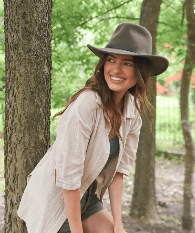 The Olive Wool Felt Outback Hat is designed for rugged adventures while adding a touch of style. Its durable wool felt construction and faux leather trim make it versatile and perfect for outdoor wear.