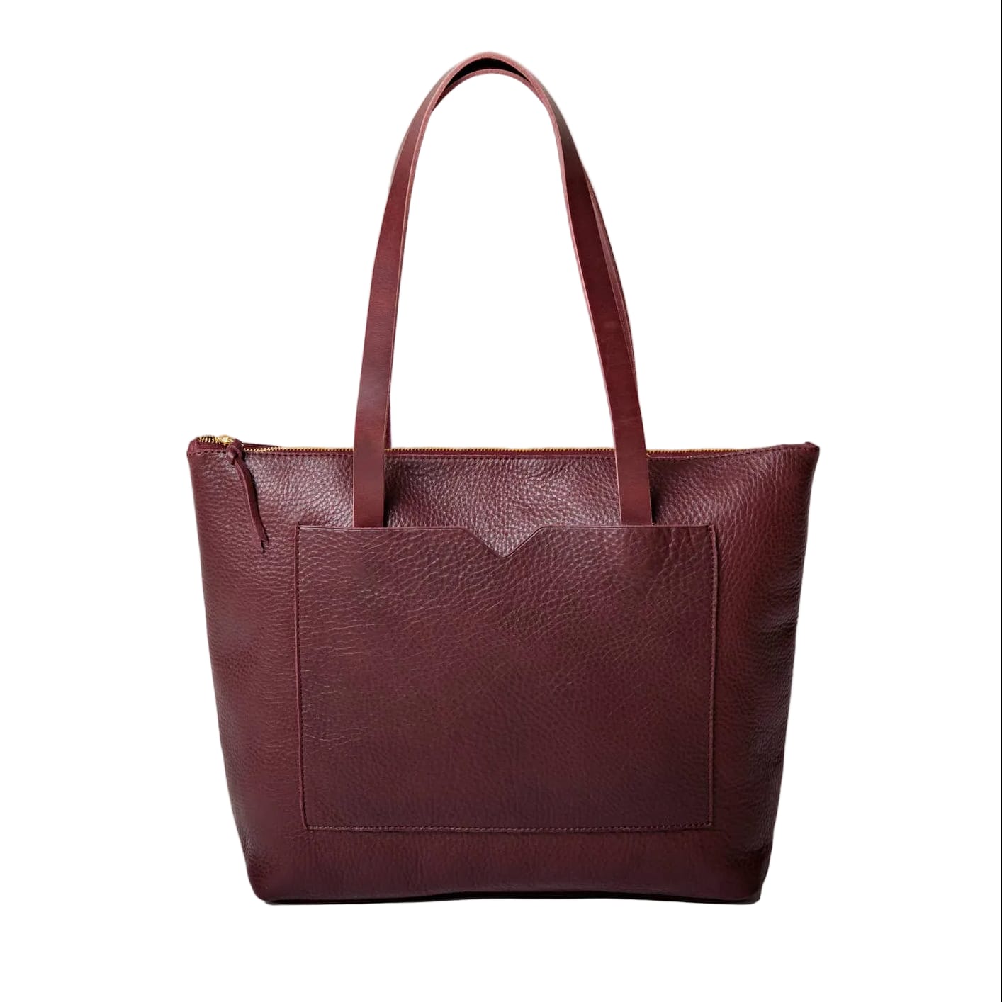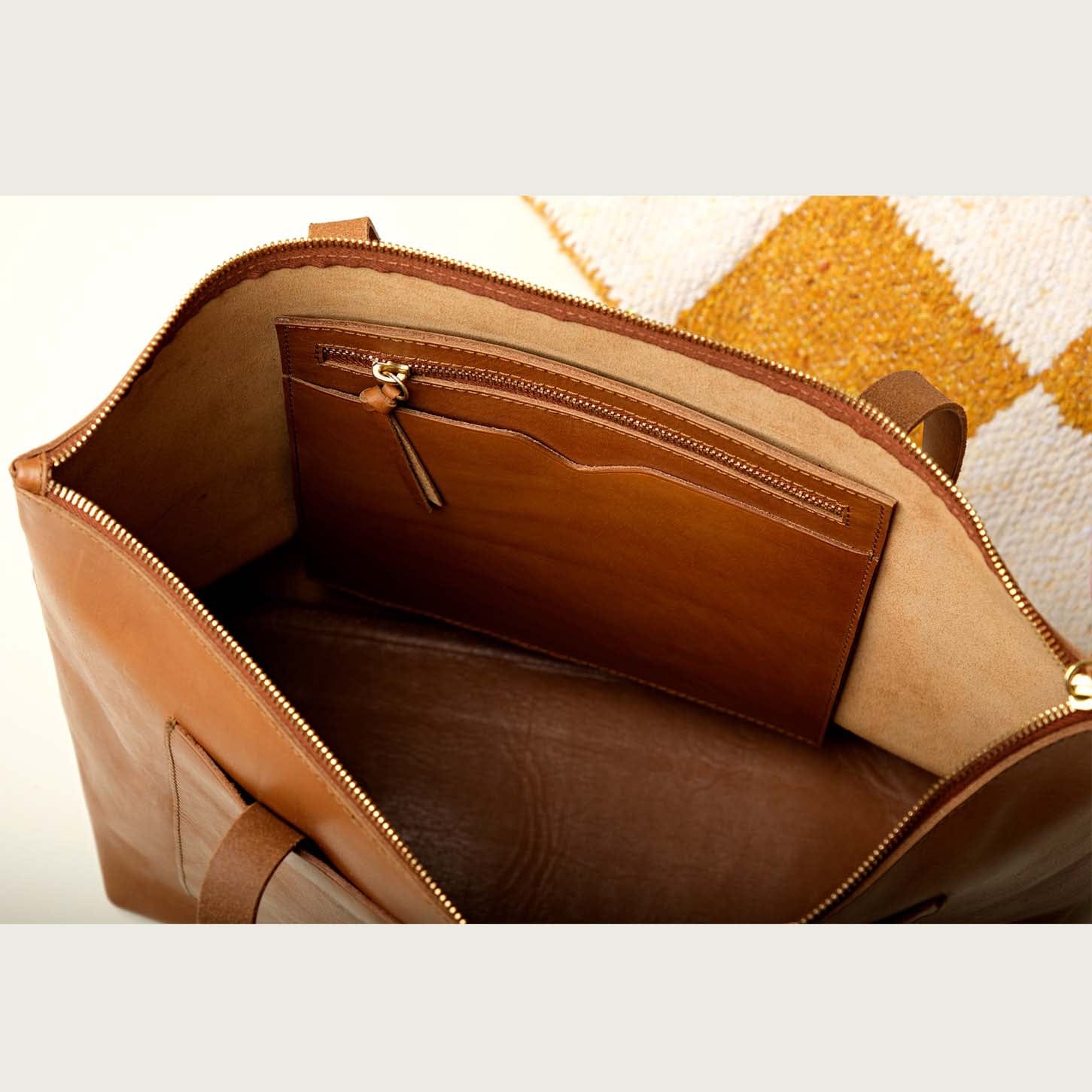 This zippered tote is a beautiful workhorse. Crafted from full-grain leather, it's designed to carry all you need and get better with each passing season. The double-reinforced base and internal zipper pocket keep your items safe and secure.
