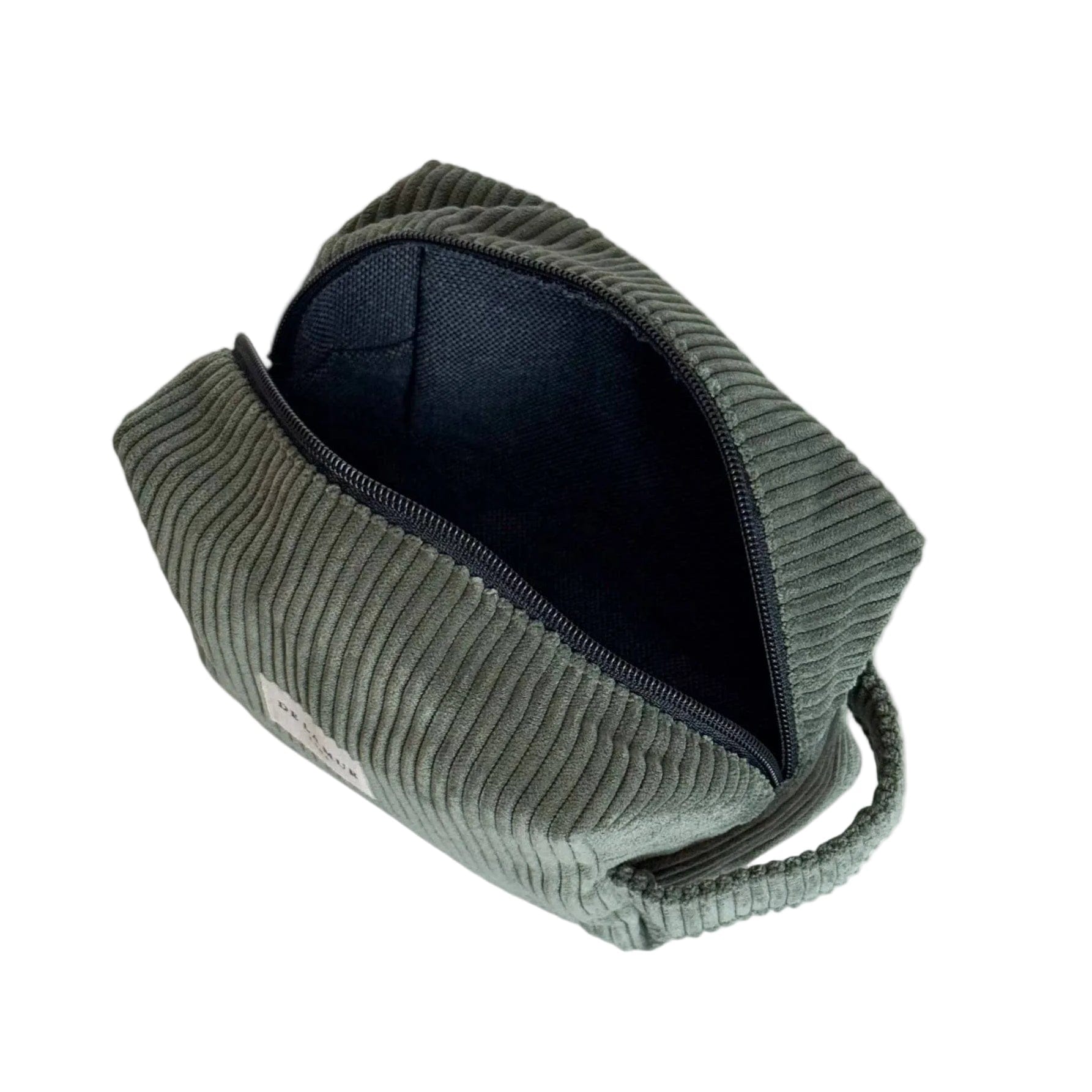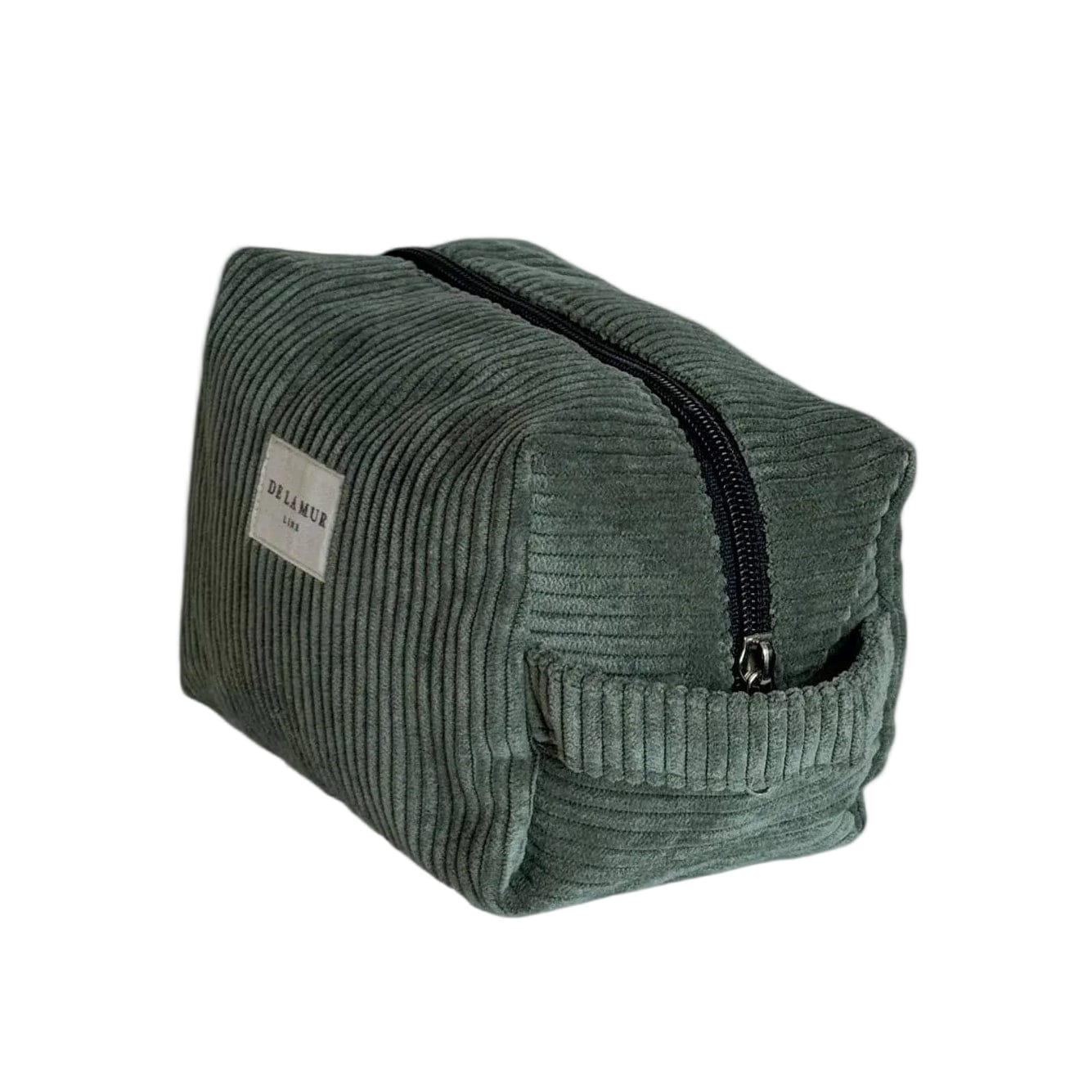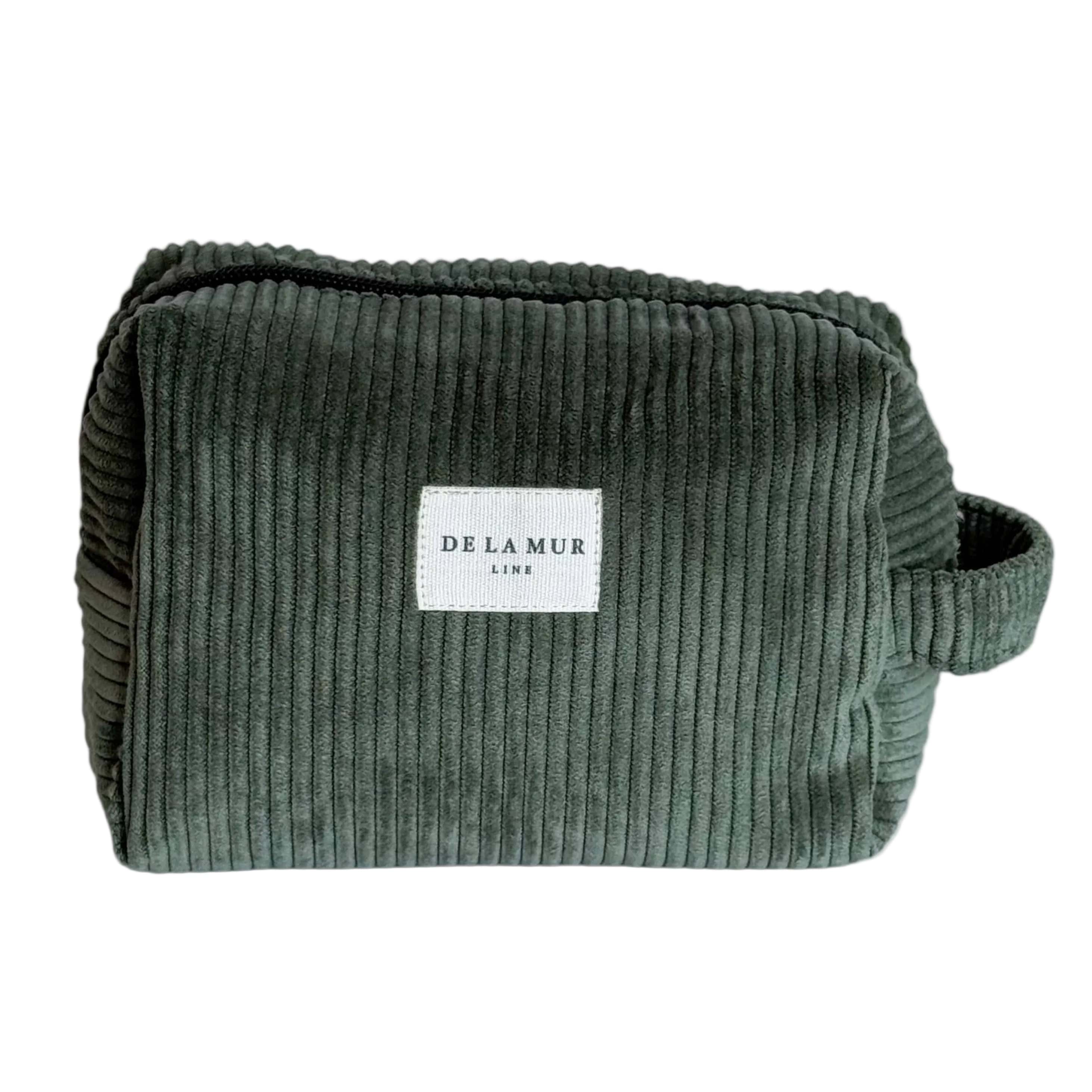 A medium-sized pouch with a zipper on top and a side handle, made from thick green corduroy in muted Tree green. Ideal for storing makeup, facial creams, and small bottles.