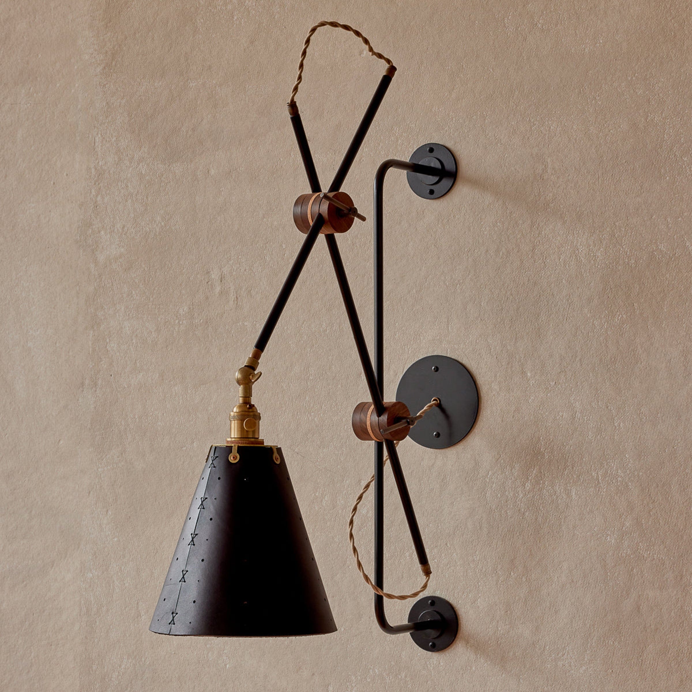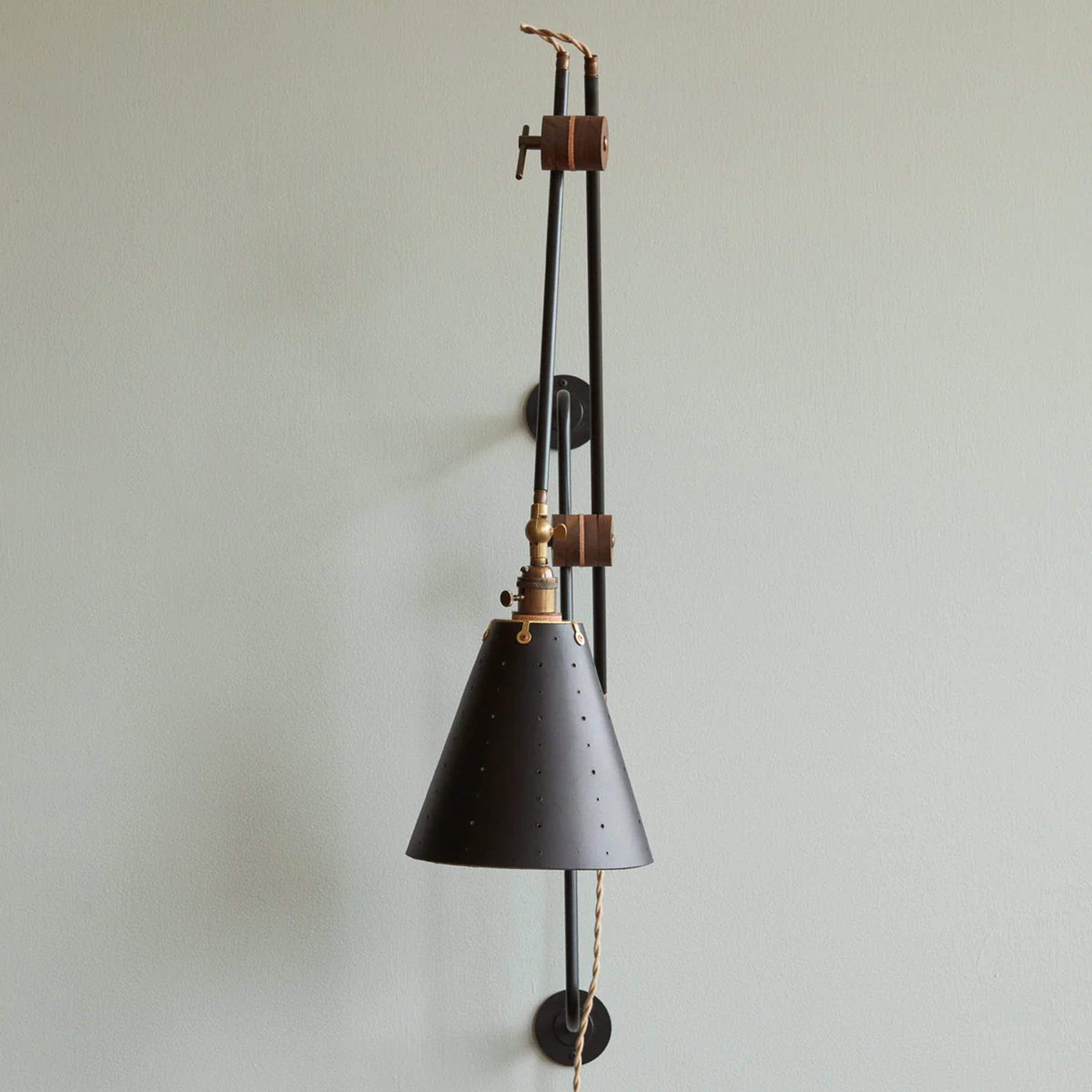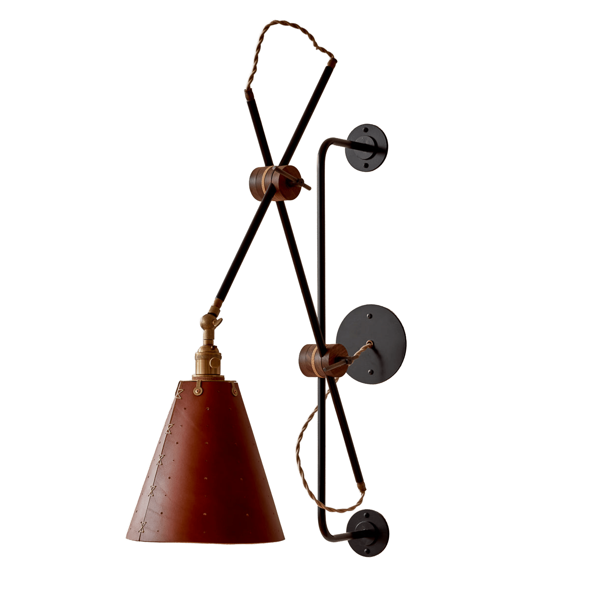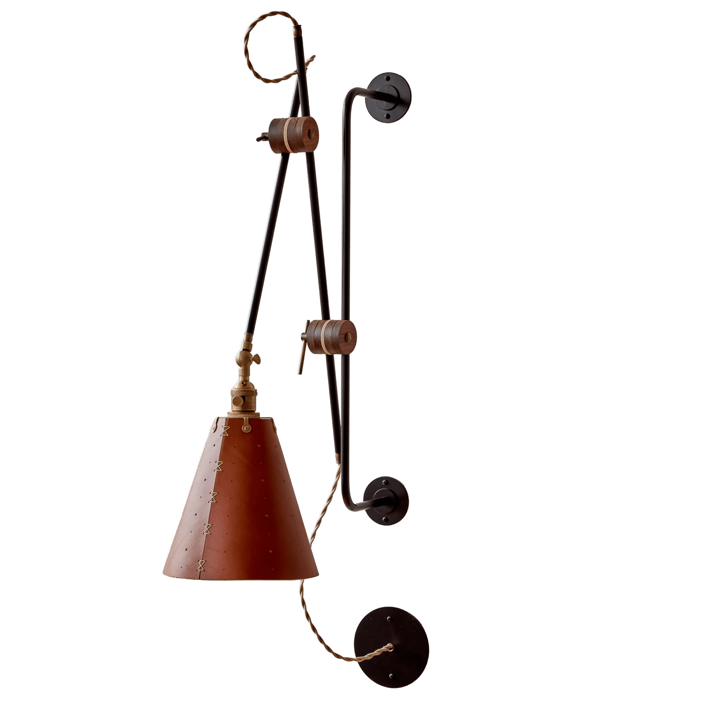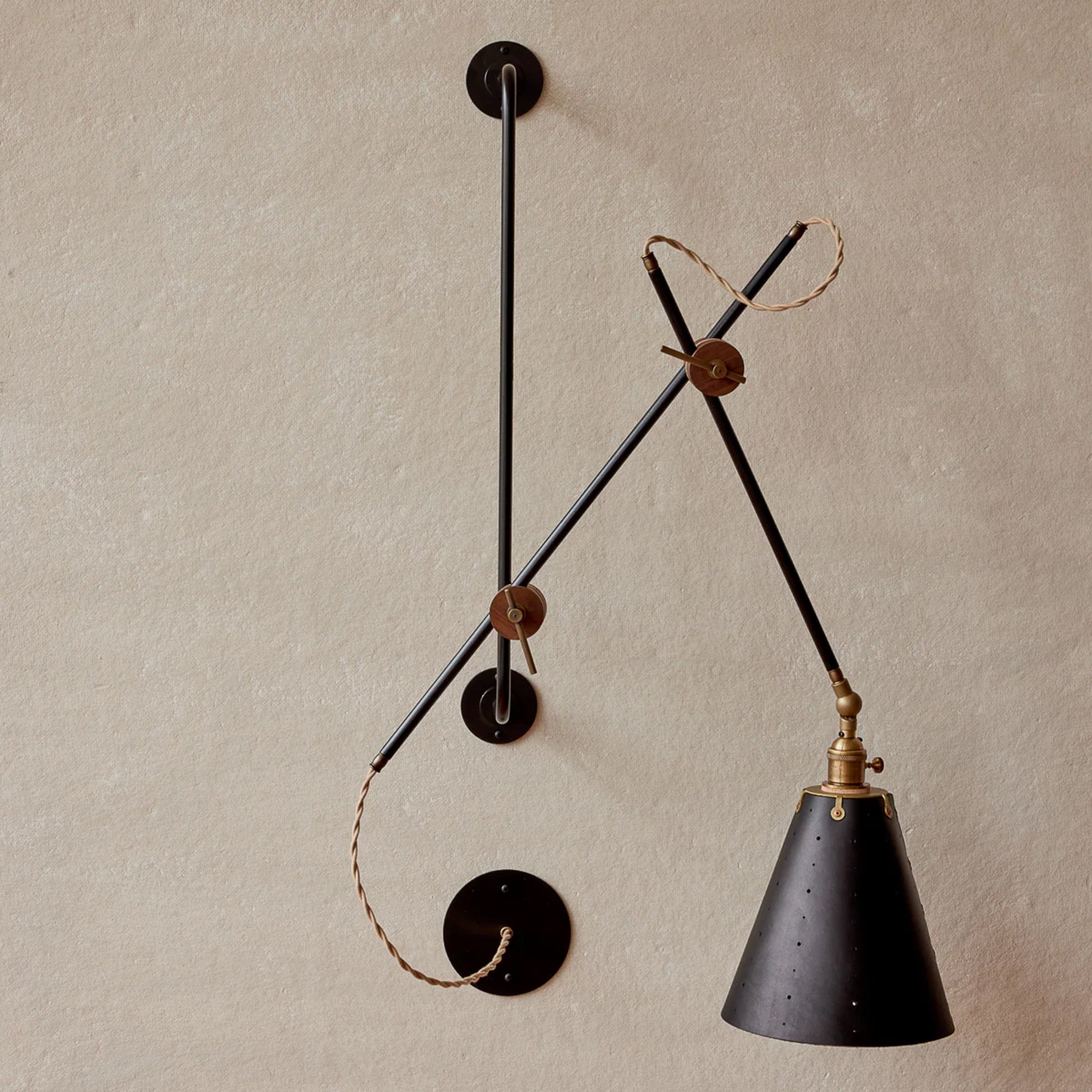 Celebrated for its striking composition and versatility, the Grace Articulating Wall Sconce is a true hallmark of ingenuity in lighting design. As handsome as it is useful, this sconce can be plug-in or hardwired. It connects two lengths of steel piping with a black walnut joint that can easily be loosened for articulation and locked into place with a brass bar. A second joint connects the fixture to a wall-mounted steel bar allowing it to slide up and down. To create a complete range of motion, simply pivot the shade in all directions as a spotlight. Small perforations in the hand-stitched leather shade soften the presentation. Use as a desk lamp over a drafting table, as a bedside light, or simply mount adjacent to your favorite leather club chair.