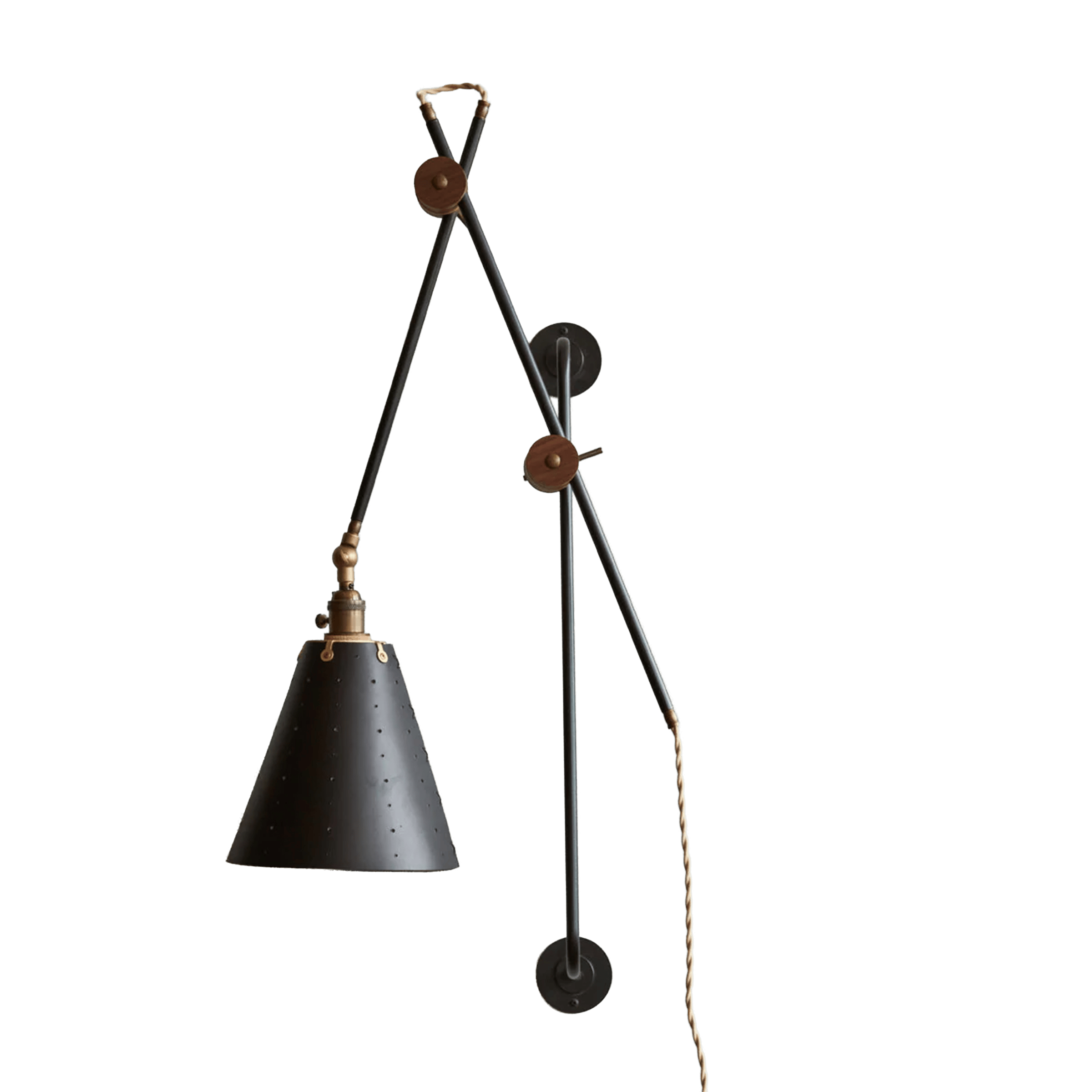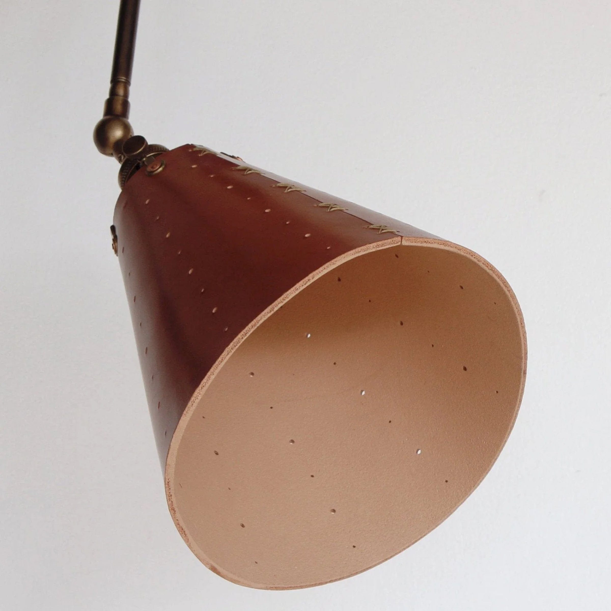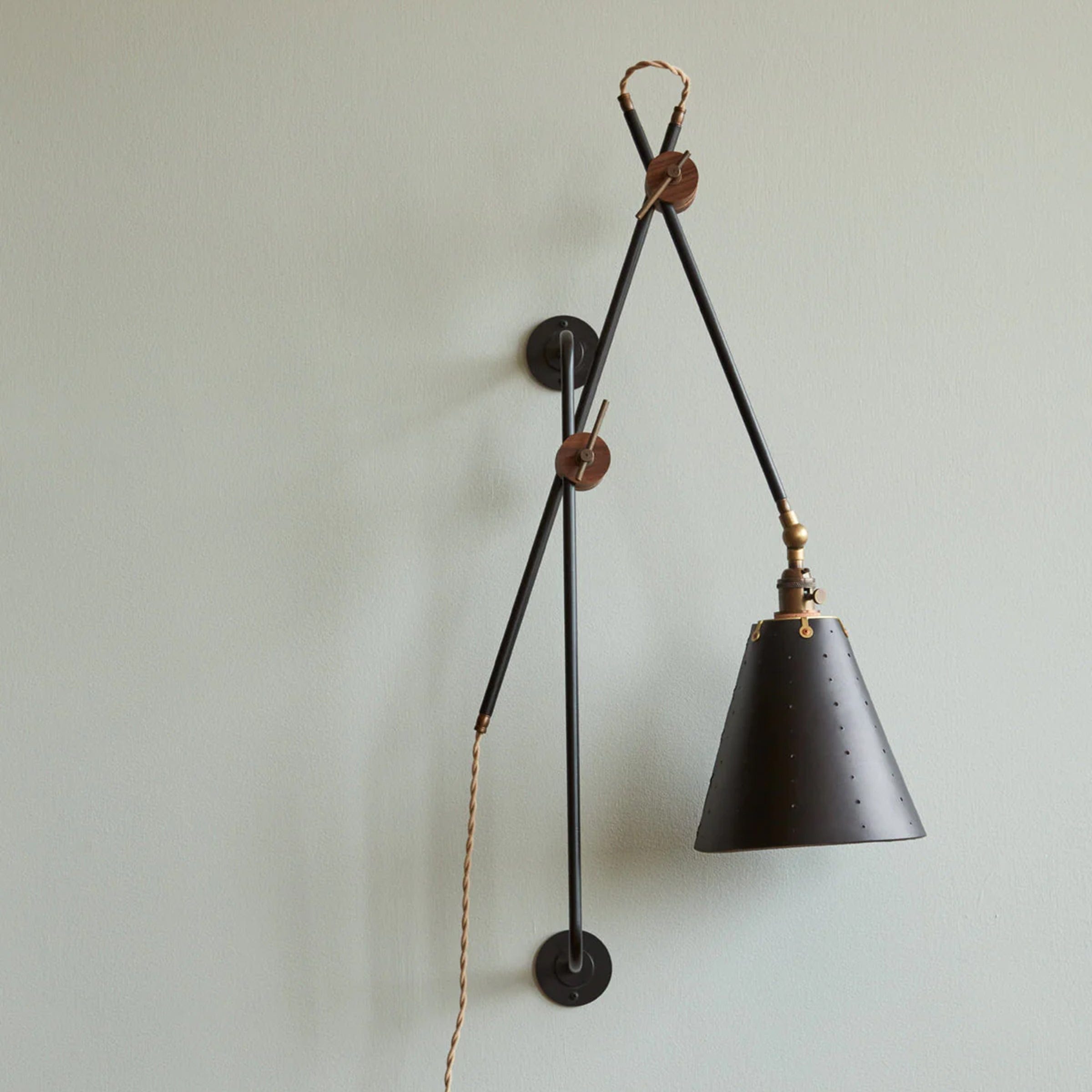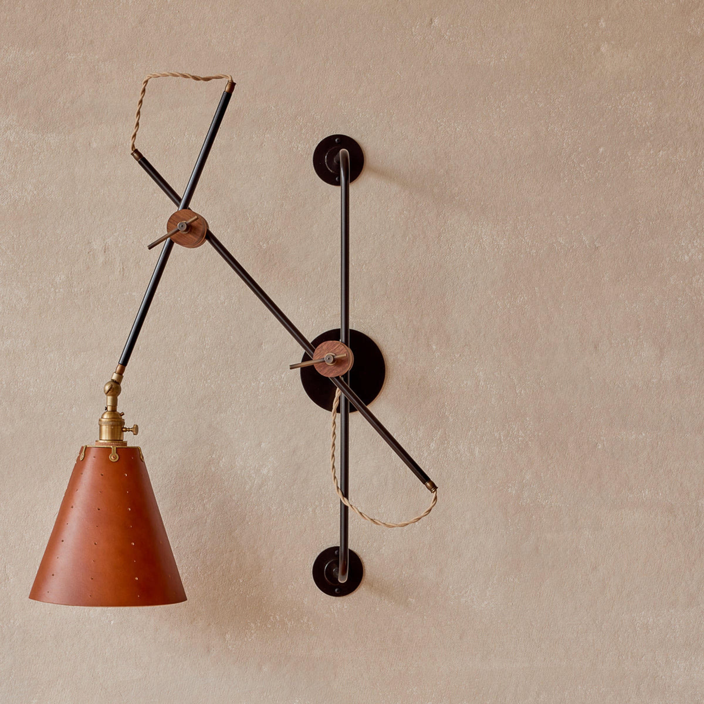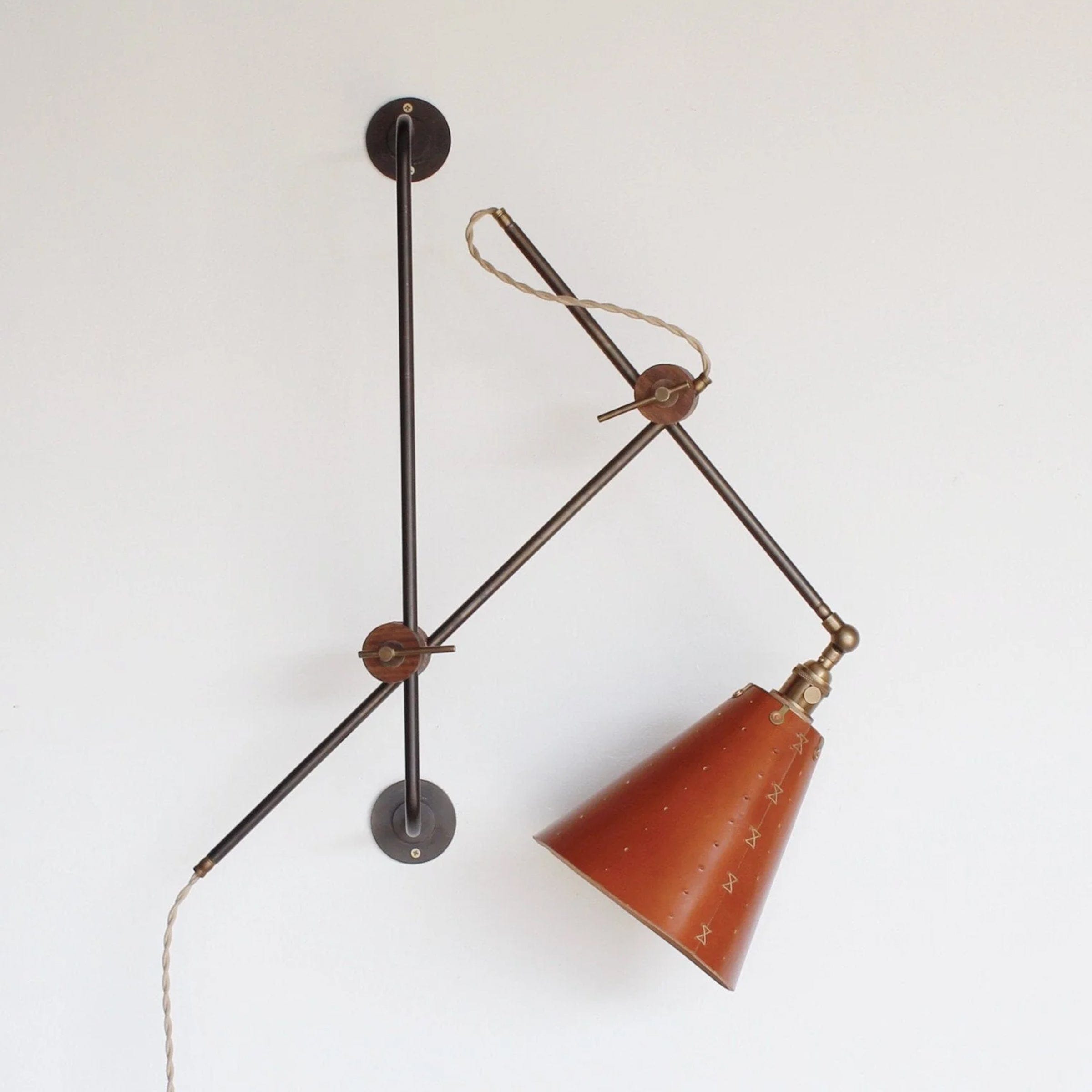 Celebrated for its striking composition and versatility, the Grace Articulating Wall Sconce is a true hallmark of ingenuity in lighting design. As handsome as it is useful, this sconce can be plug-in or hardwired. It connects two lengths of steel piping with a black walnut joint that can easily be loosened for articulation and locked into place with a brass bar. A second joint connects the fixture to a wall-mounted steel bar allowing it to slide up and down. To create a complete range of motion, simply pivot the shade in all directions as a spotlight. Small perforations in the hand-stitched leather shade soften the presentation. Use as a desk lamp over a drafting table, as a bedside light, or simply mount adjacent to your favorite leather club chair.