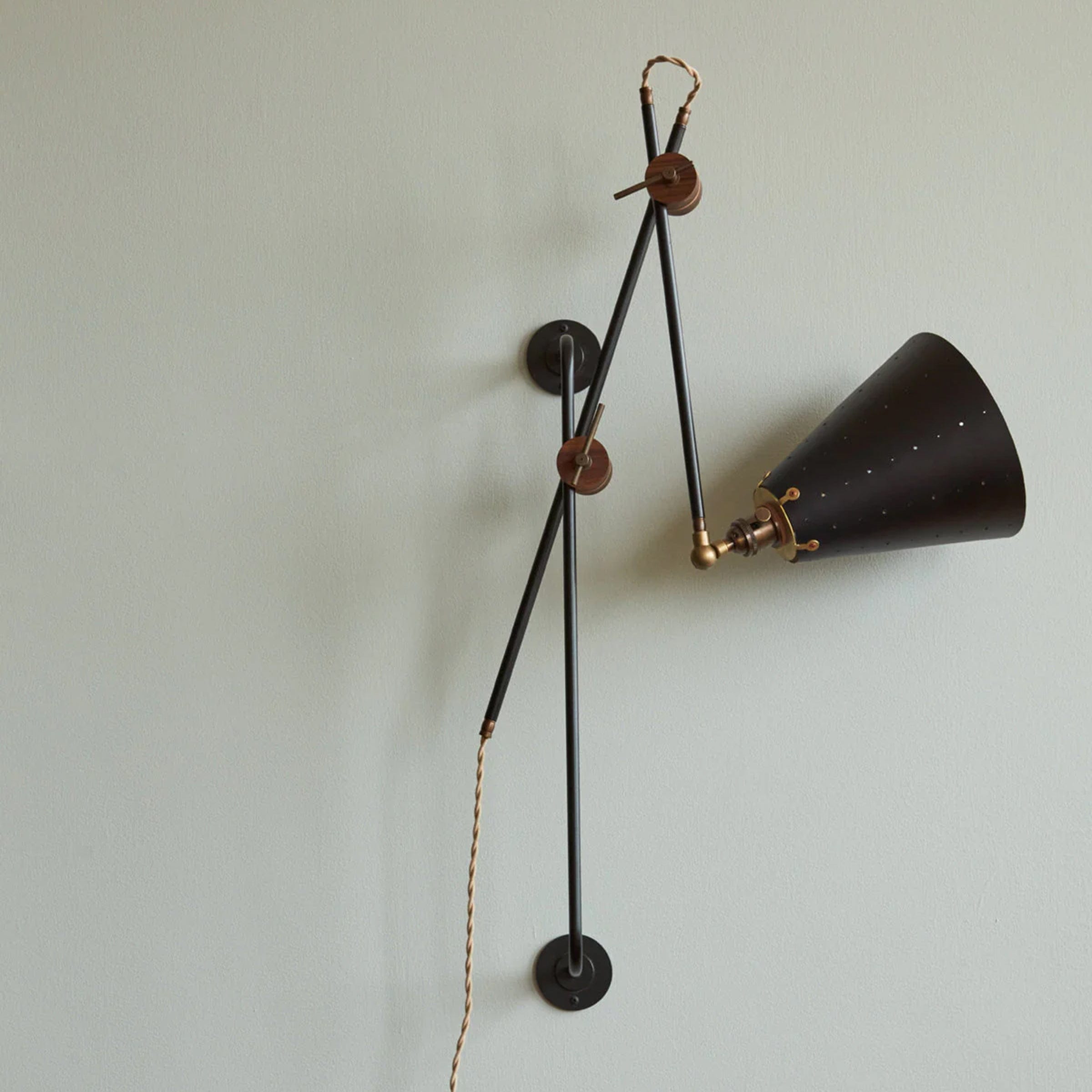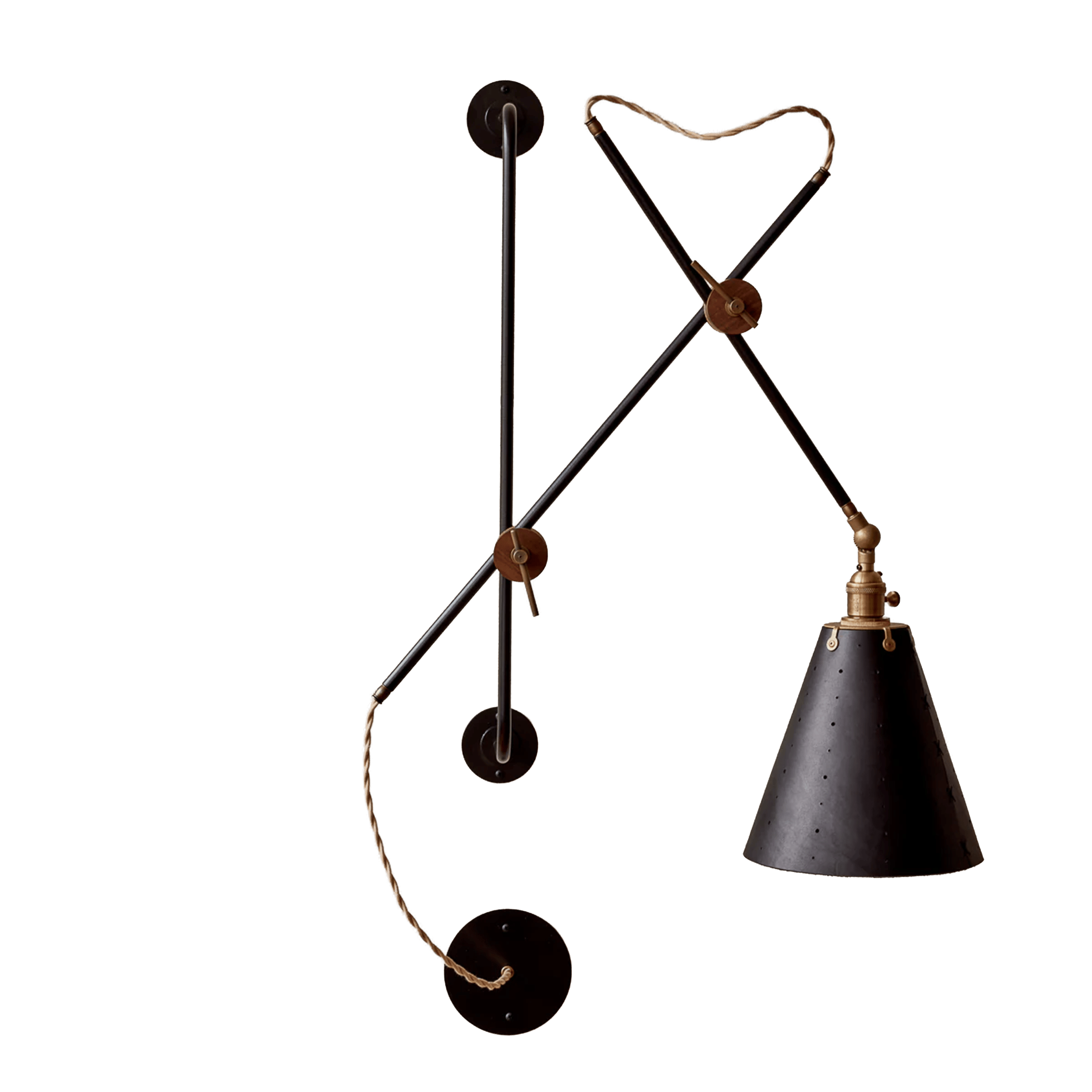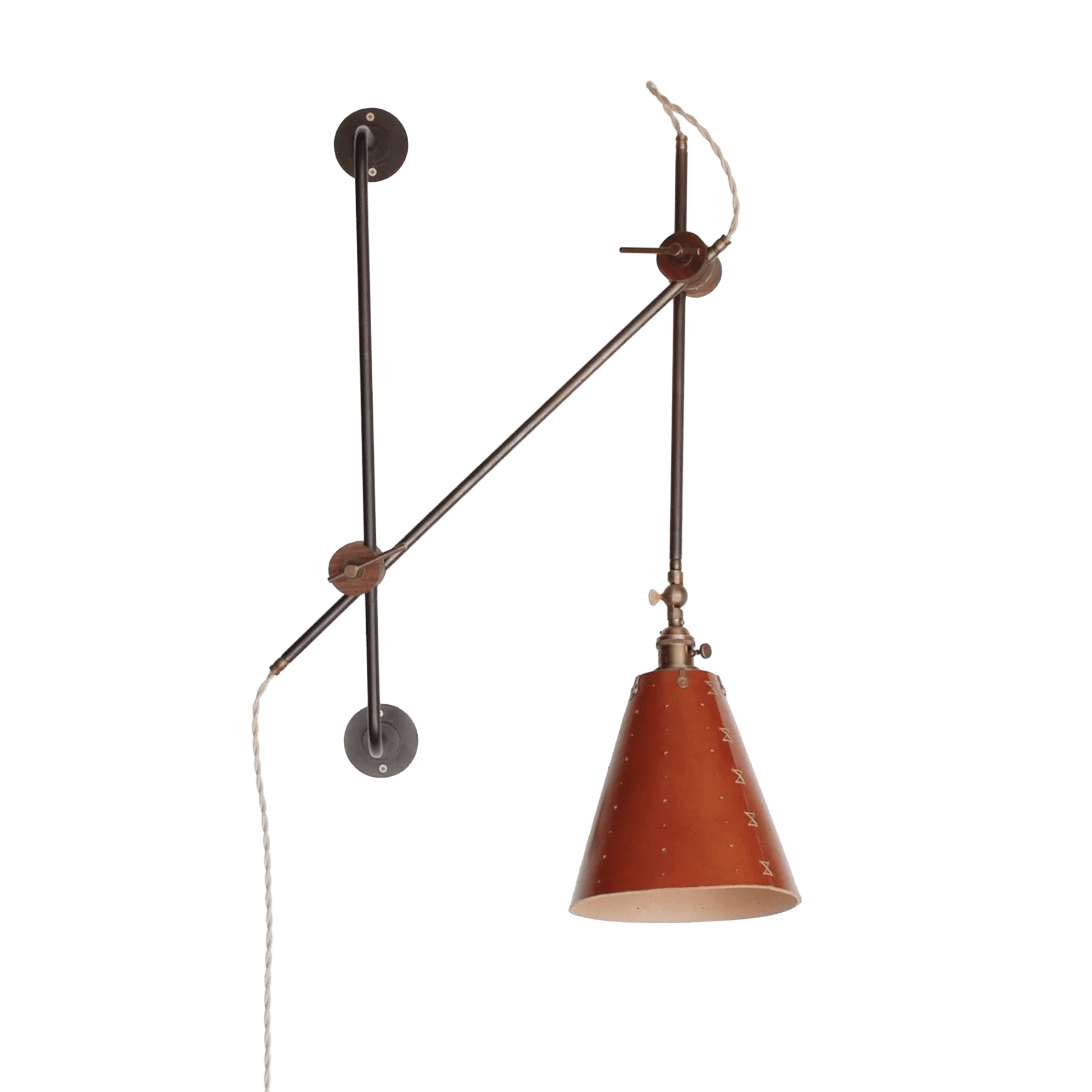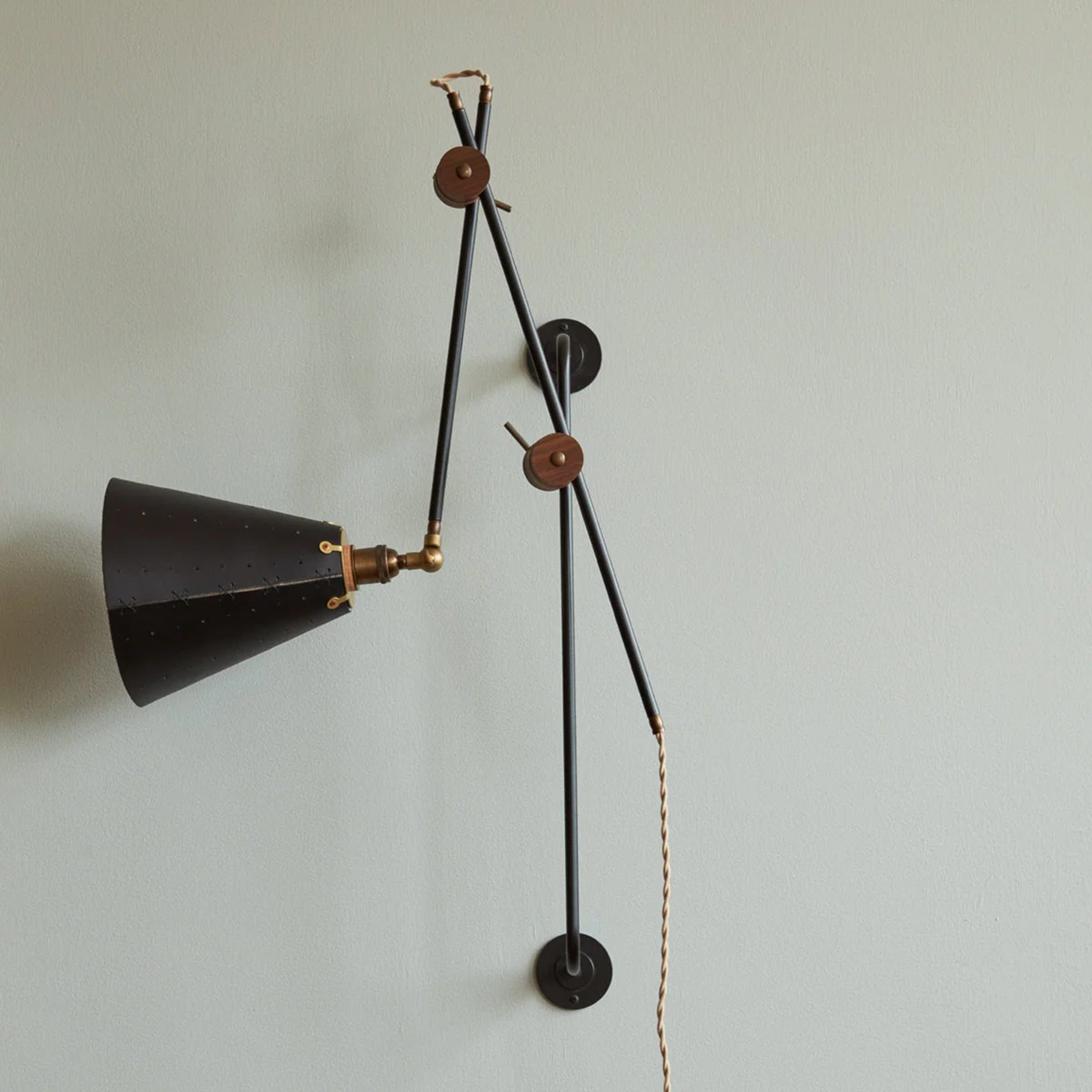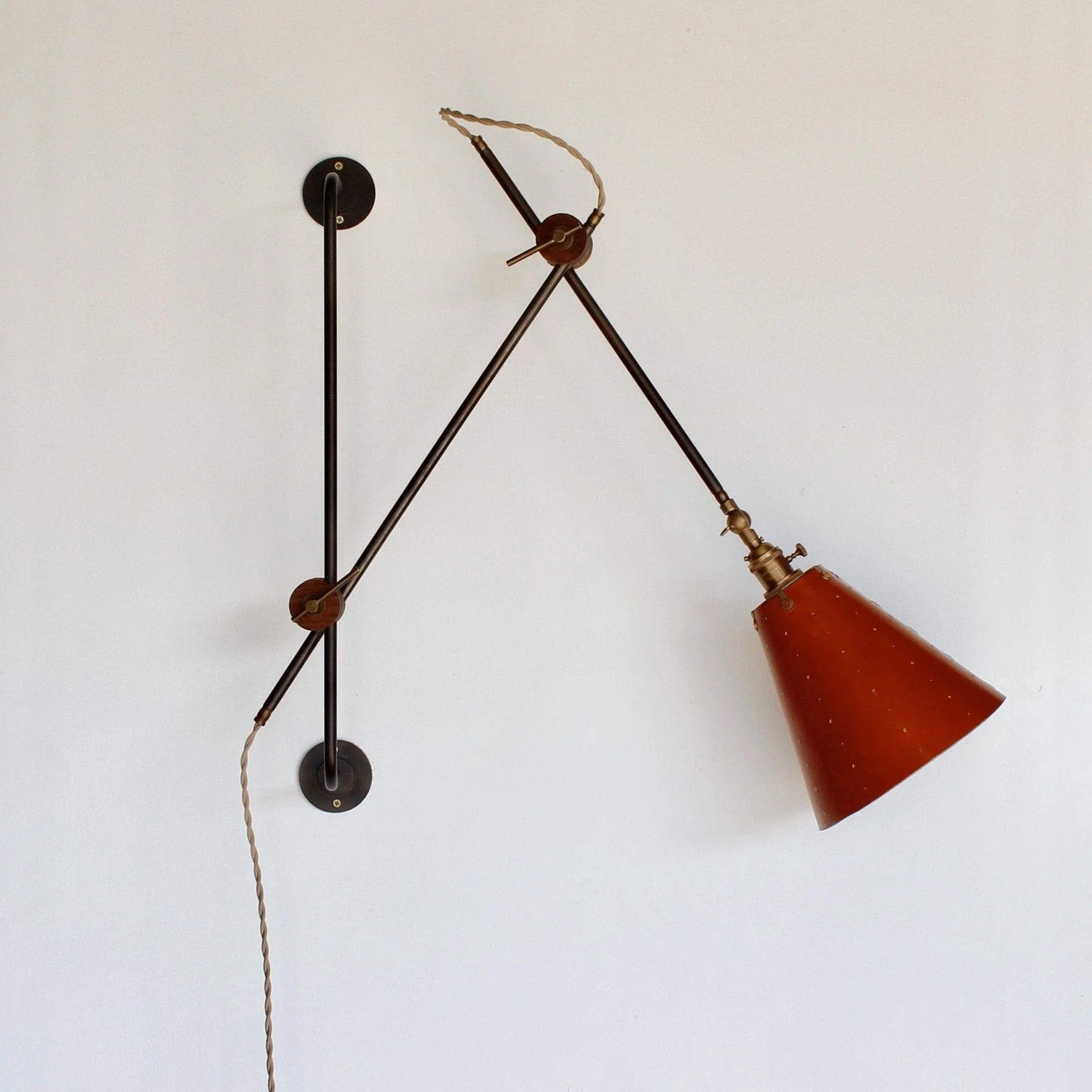 Celebrated for its striking composition and versatility, the Grace Articulating Wall Sconce is a true hallmark of ingenuity in lighting design. As handsome as it is useful, this sconce can be plug-in or hardwired. It connects two lengths of steel piping with a black walnut joint that can easily be loosened for articulation and locked into place with a brass bar. A second joint connects the fixture to a wall-mounted steel bar allowing it to slide up and down. To create a complete range of motion, simply pivot the shade in all directions as a spotlight. Small perforations in the hand-stitched leather shade soften the presentation. Use as a desk lamp over a drafting table, as a bedside light, or simply mount adjacent to your favorite leather club chair.