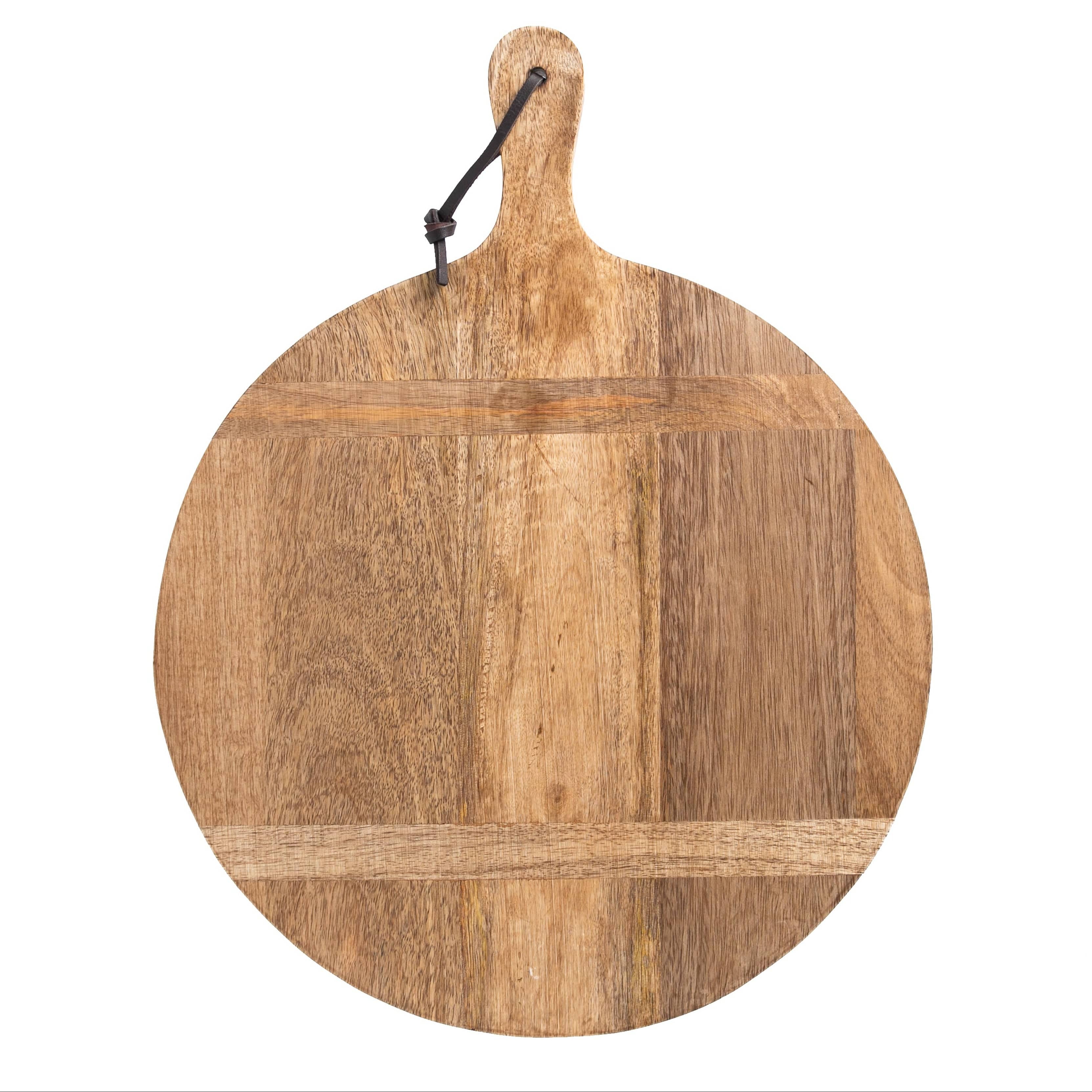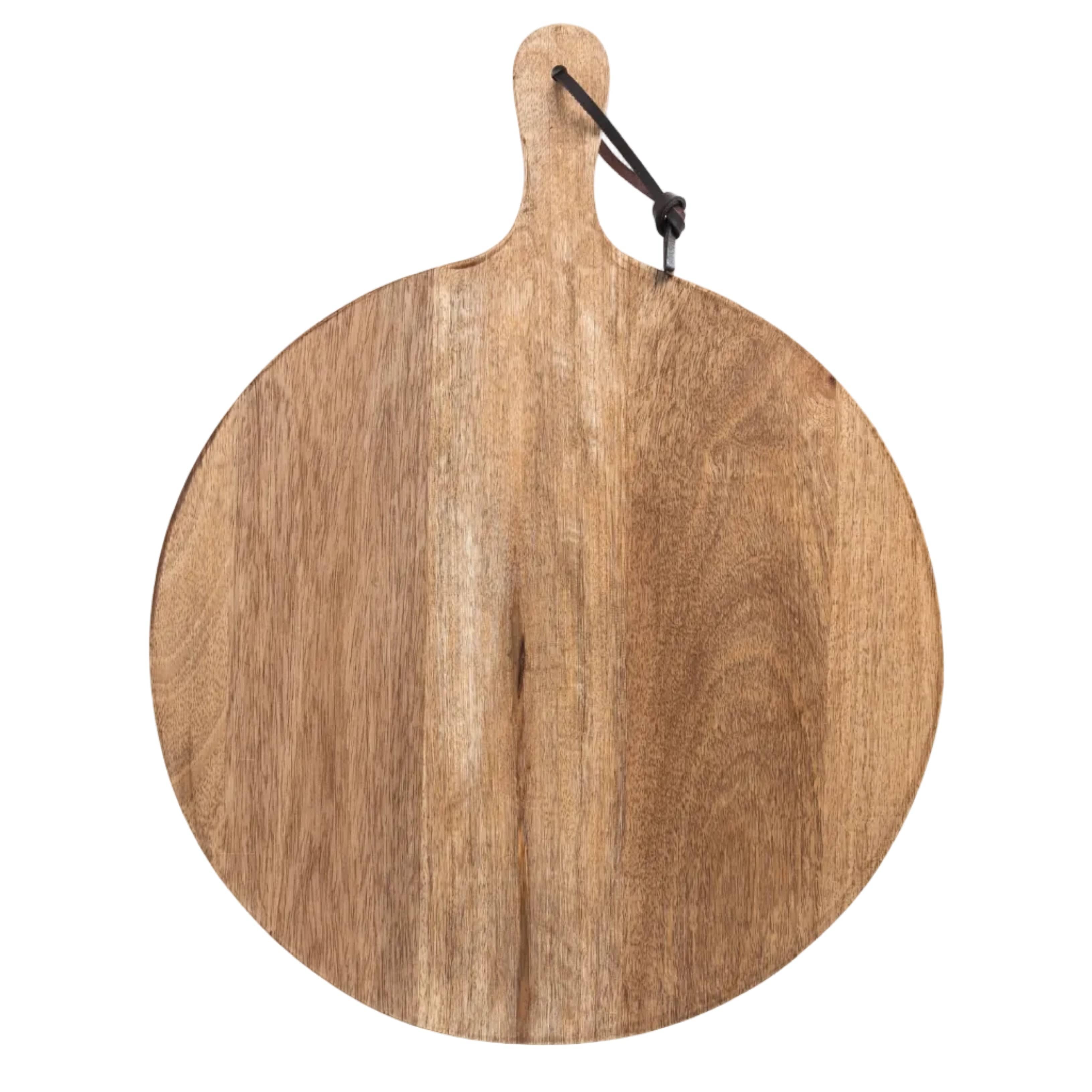 A solid wood serving board designed for easy entertaining. The generous surface works well for breads, cheeses, pizza, or charcuterie and looks just as good on the table as it does on the kitchen counter.
