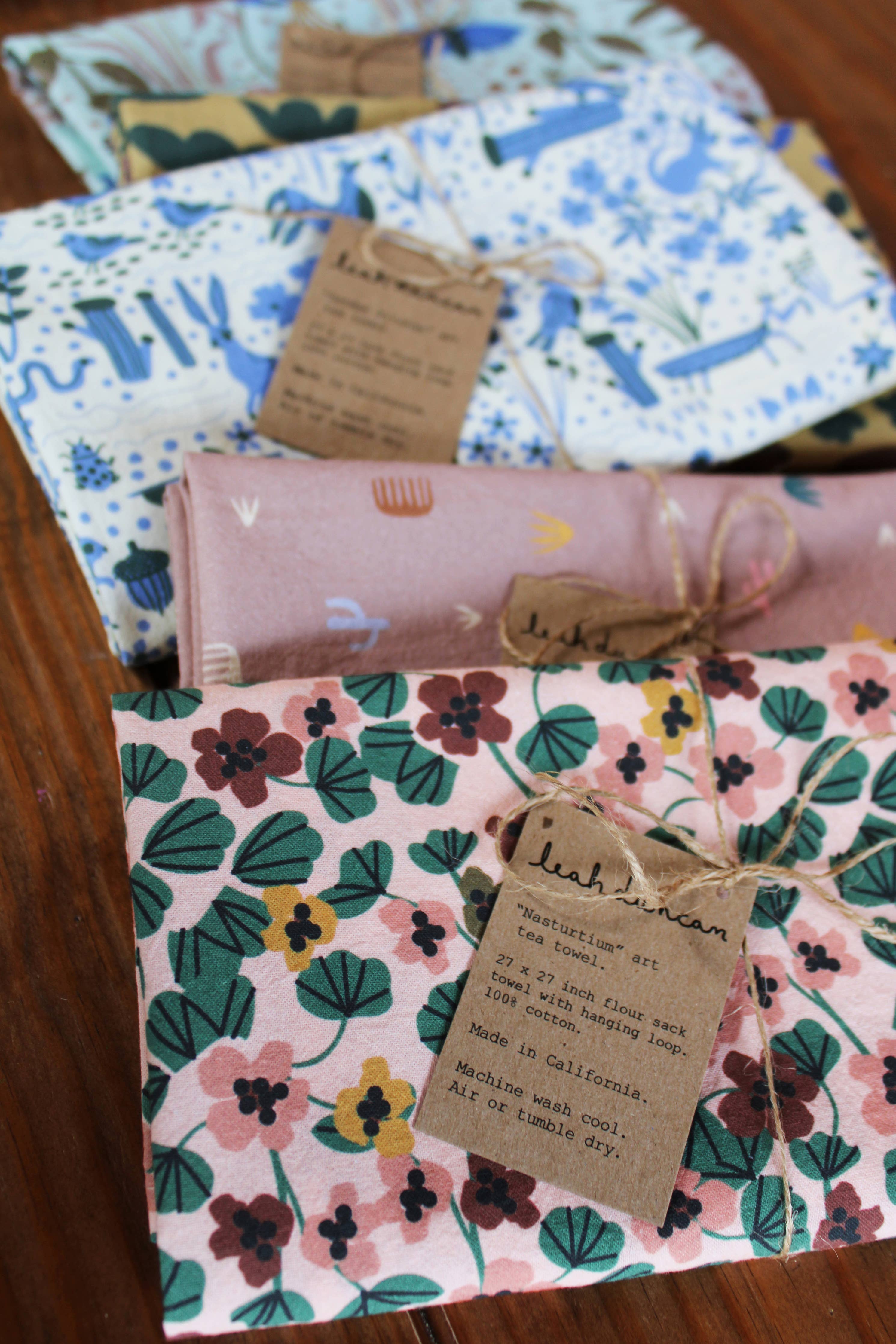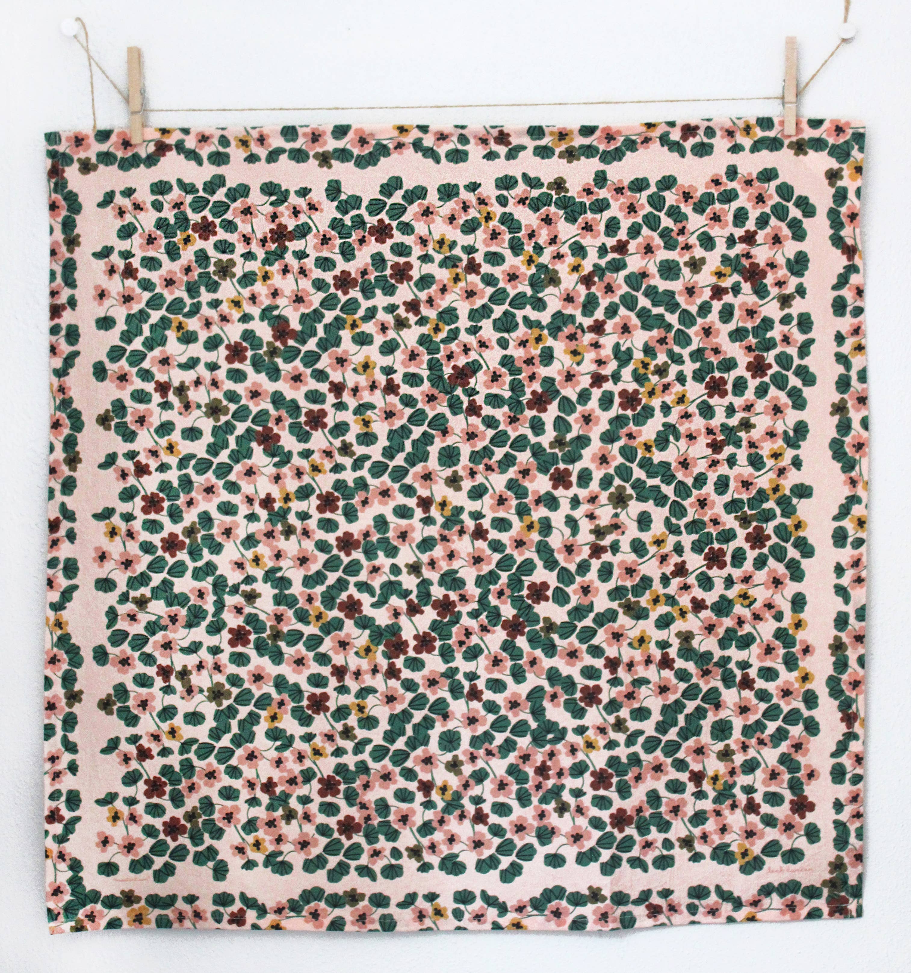 This is a flour sack tea towel featuring a floral design. It features colors of green, brown, olive, and golden yellow on a peach background. Pretty enough to hang on your wall or display in your kitchen.