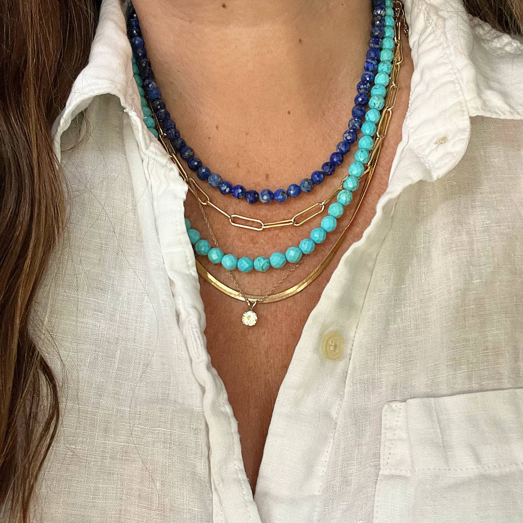 Your new favorite piece: a gemstone bead necklaces — available with chunky turquoise or tiger eye beads — are a color statement that simply makes every outfit better.
