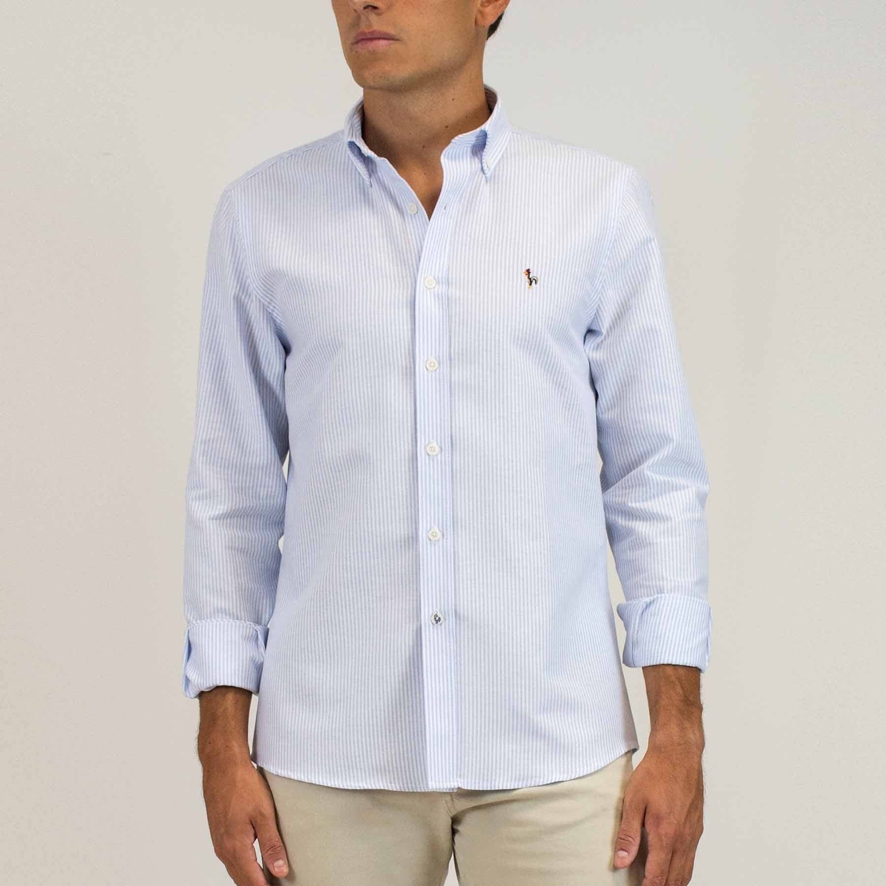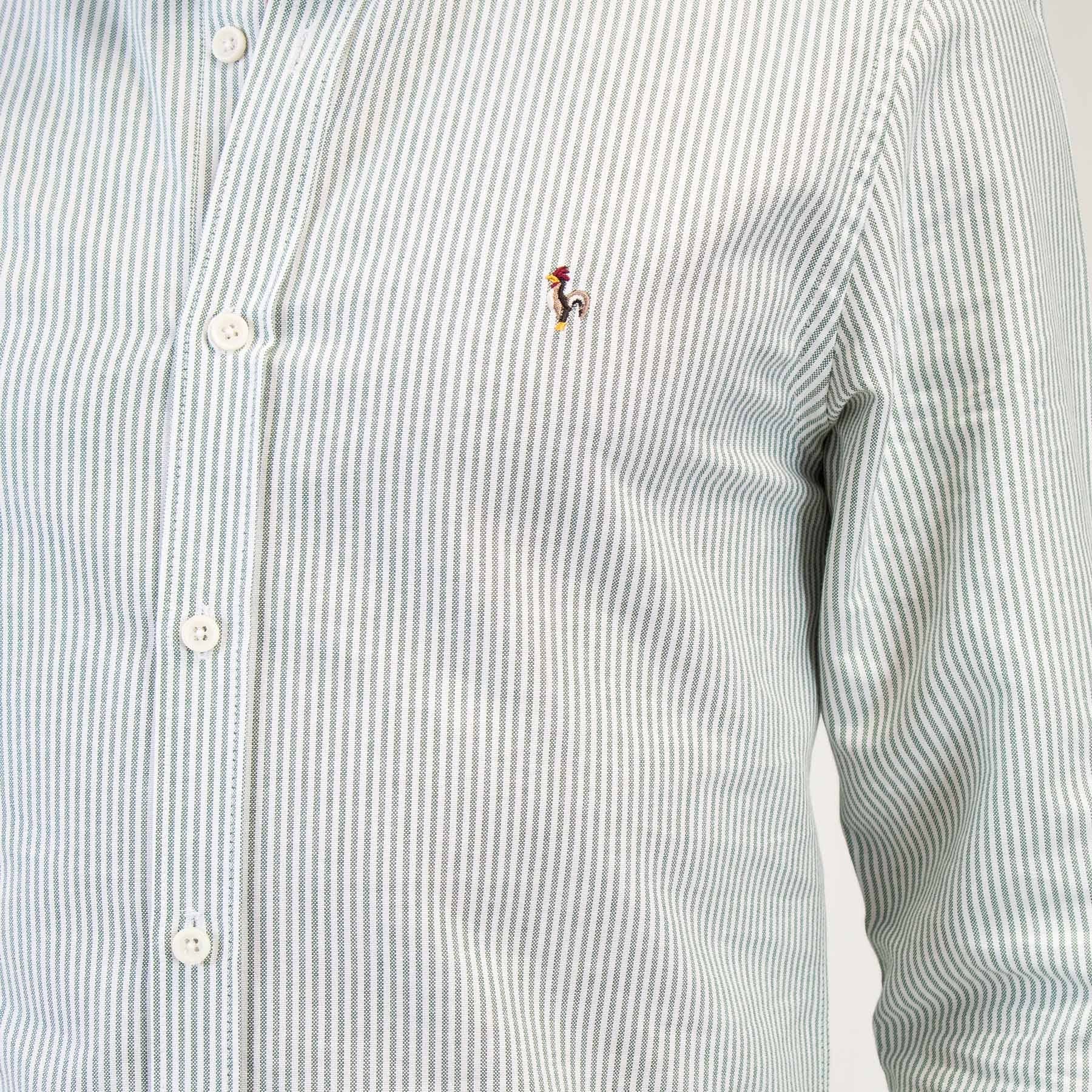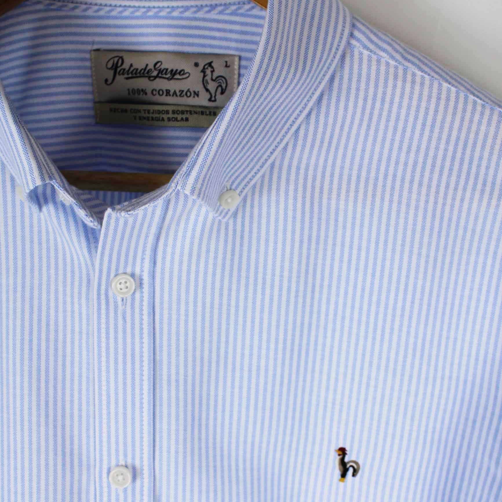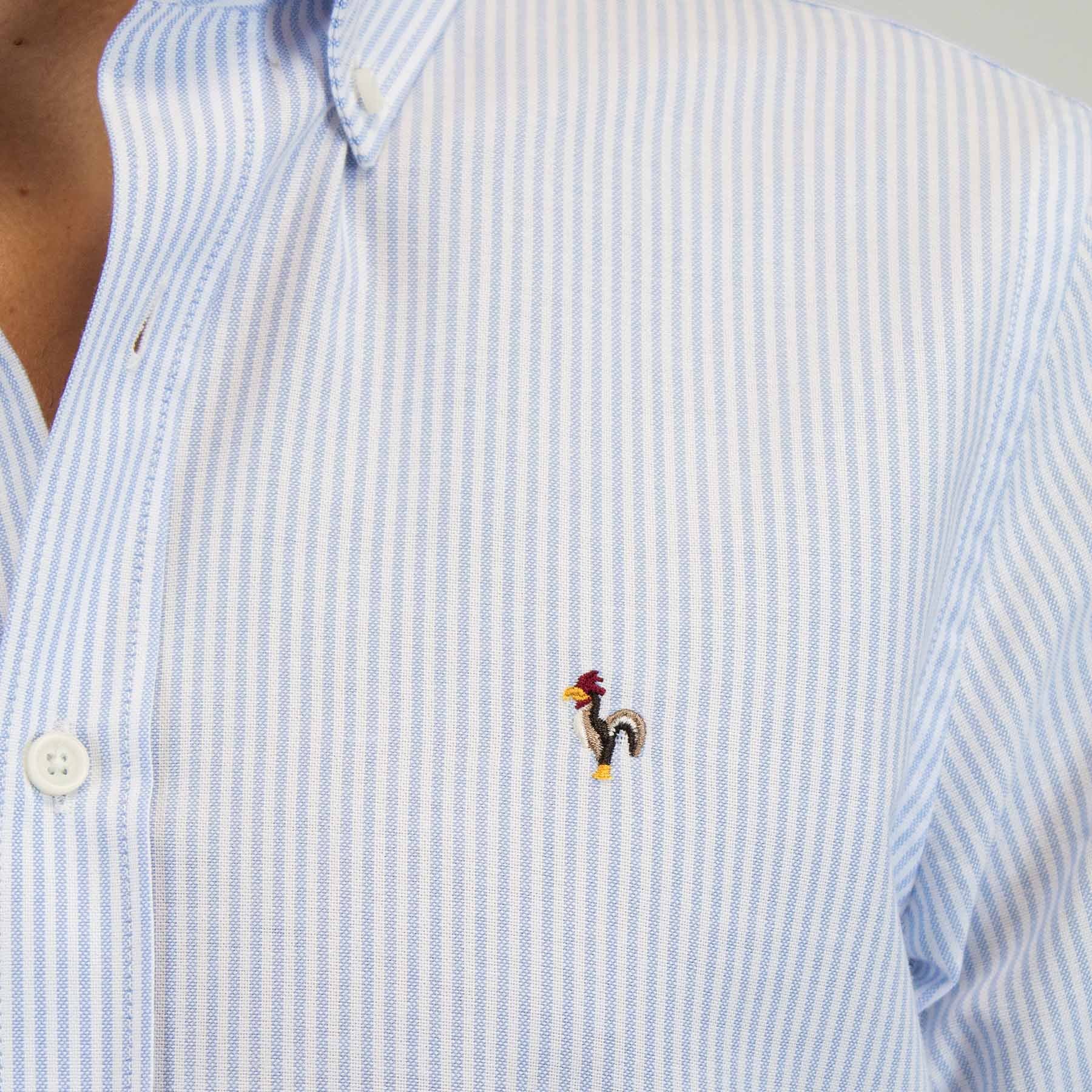 Patadegayo striped Oxford shirts are crafted in their workshop in Priego de Córdoba, Spain. Made with the finest fabric, these shirts exemplify exceptional craftsmanship, care, heart, and attention to detail. They feature a classic button-down collar and long sleeves. The embroidered rooster logo on the chest adds a fun touch, complemented by the distinctive rooster button.