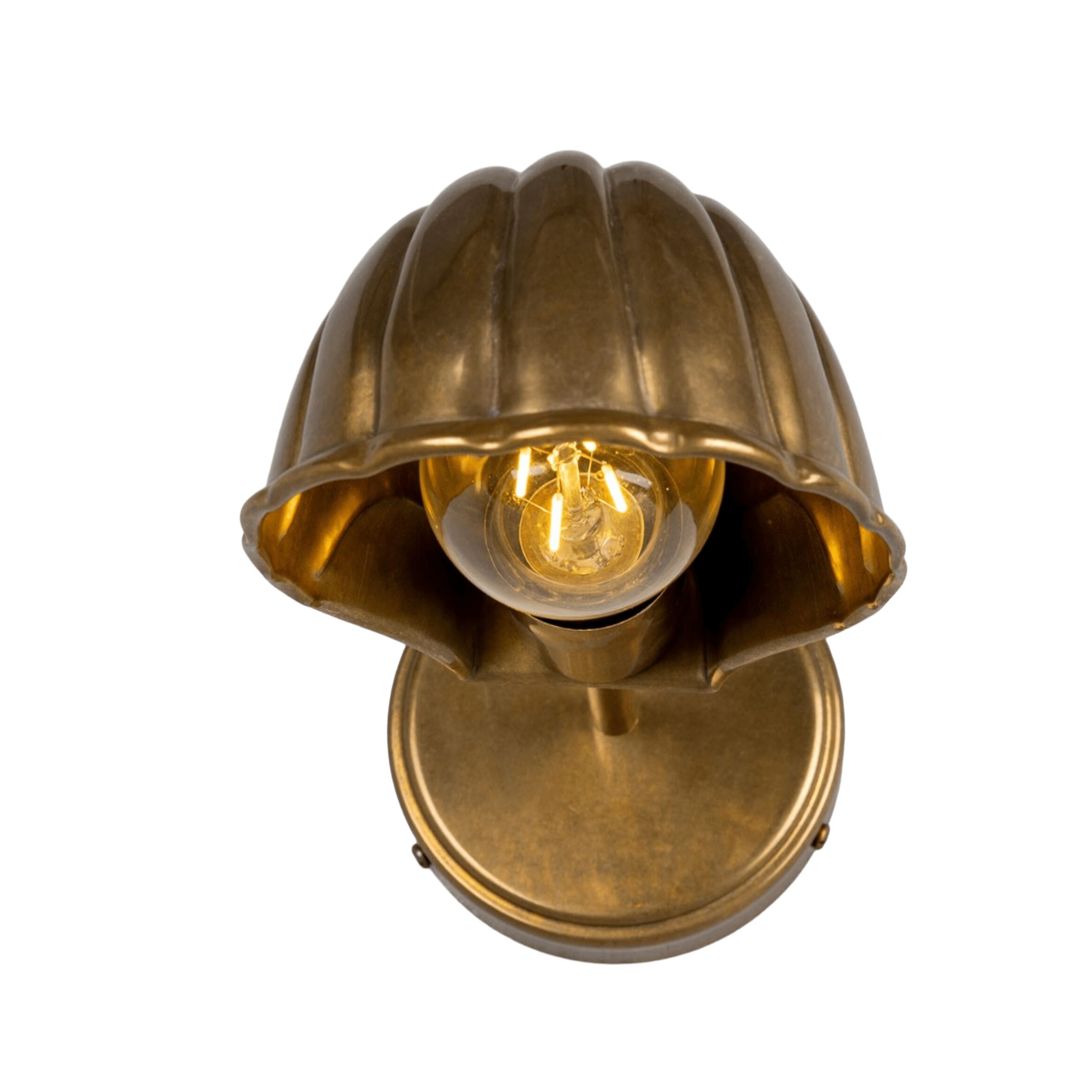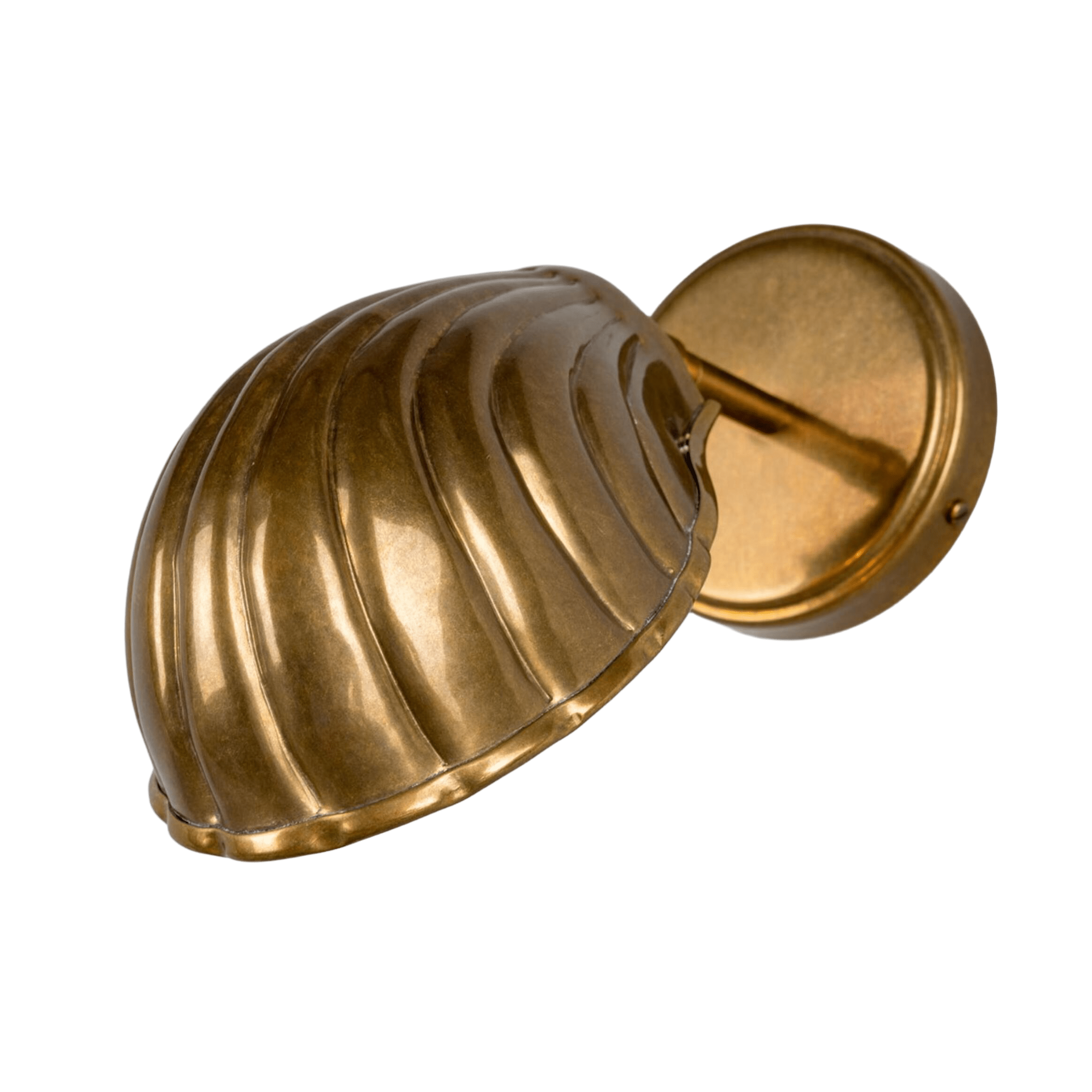 The Shell wall sconce draws inspiration from early 20th-century design, showcasing its artistic shape and vintage appeal. Crafted from solid brass, this wall light has a unique scallop-shaped shade with pronounced ridges and a curved edge. It is attached to a round brass backplate, and the adjustable arm lets you position the shell to provide both decorative charm and directed light. Its design evokes the grand ambiance of classic concert halls and iconic cabarets. Ideal for cozy corners, inviting lounges, or as a stylish touch in hallways where you want to add a bit of vintage charm. Also shop the similar, Coco Adjustable Ceramic Sconce. Bulbs are sold separately.