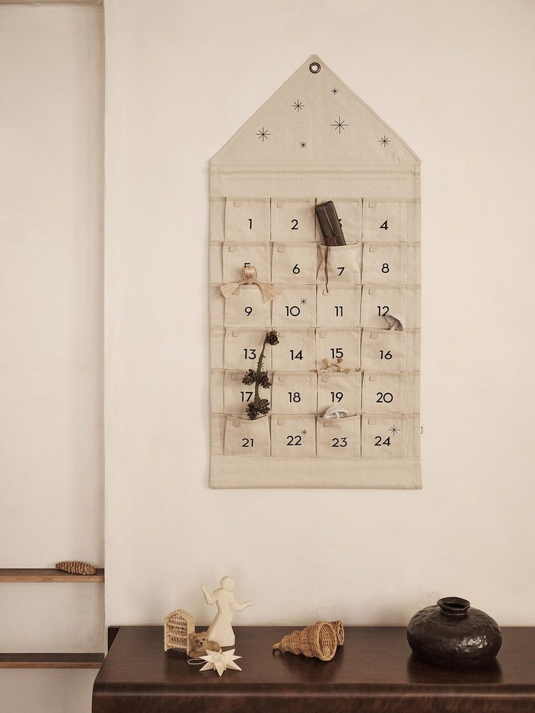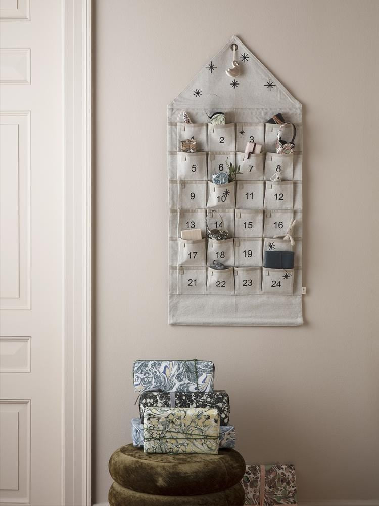 The ways of getting in the spirit in the days up until Christmas are many. A tradition we treasure is the Christmas calendar with small gifts every day untill Christmas Eve. This canvas house has golden embroideries and 24 little pockets – one for each day of December.